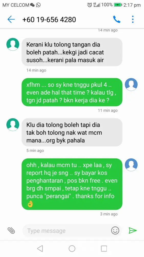 Hi. Kejadian baru shj berlaku tadi 17/1/2018 waktu 5.30 petang. Please cakap dgn rider awak yang menggunakan number +[protected] kenapa datang rumah call sekali je? Kenapa tak cuba call again and kenapa tak tekan loceng rumah? Selama ni hantar barang boleh je rider lain call saya dua atau tiga kali sampai saya angkat call. Now suka2 je nak suruh saya pickup sendiri di klang! Saya tak kira saya nak barang saya hari ni juga! Atau saya akan saman pos malaysia! Saya lampirkan bukti panggilan dia dan mesej dia. Tq