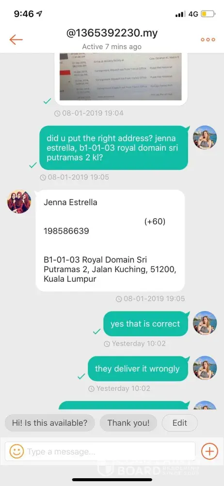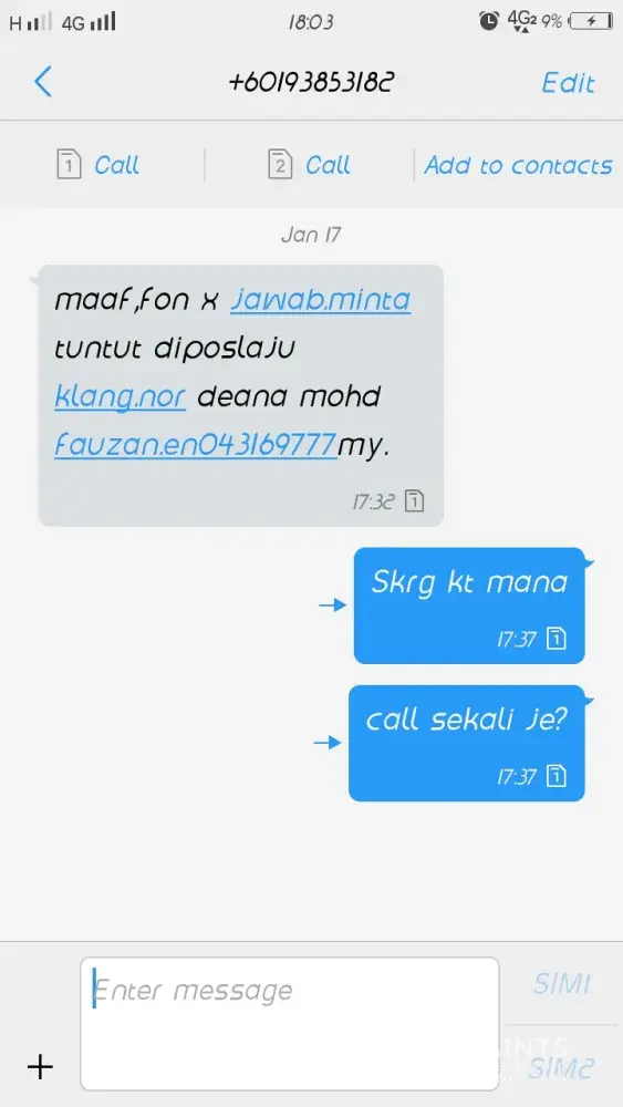Disertakan mesej yang dihantar dari nombor telefon [protected], bila suruh hantar ke alamat yang ditulis, tak balas pun.