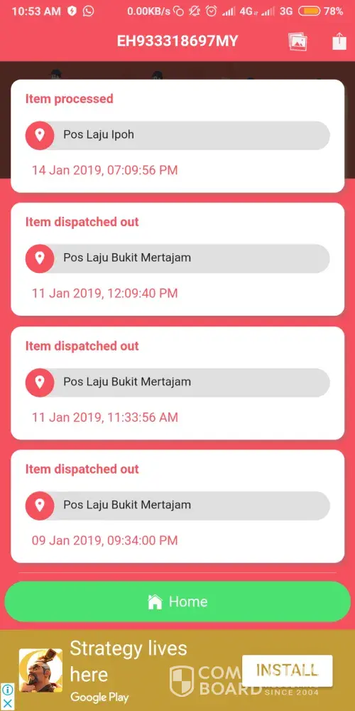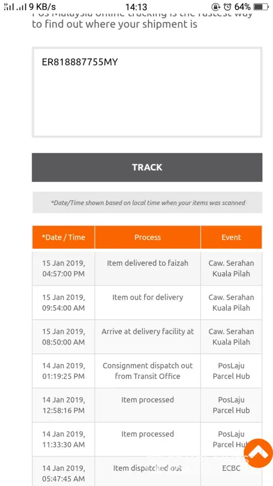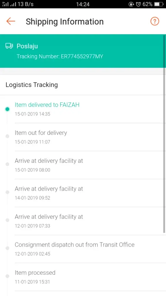 Pada 16 Jan 2019, saya telah Track order from Shopee App, untuk melihat order lain yang masih belum diterima.