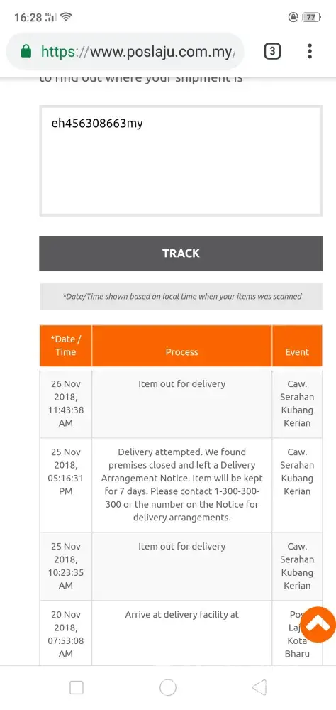 I also have another courier from another source has arrived to Poslaju Jitra on saturday 24 Nov 2018 and I went there in order to receive it, the postman there has checked my coureir and it was arrived at there location already on that day but he refused to give it to me because he said; it must be scanned first, and he informed me to wait until next day (Sunday 25 Nov 2018) and it will be delivered to me, but it did not delivered to me as his information.