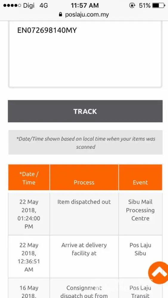 Courier kedua bertarikh 23/05/18 no tracking en929868551my saya hantar alamat yang sama dengan courier pertama ke klang, selangor. Bila check dalam track & trace, update pada 24/05/18 - arrive at delivery facility at - pos laju kluang