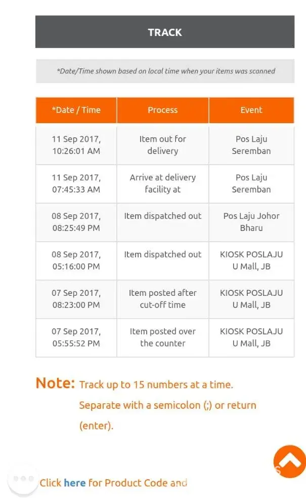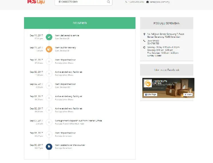 Item ini telah sampai ke pos laju batu caves pada 12/09/2017 7.02am dan diserahkan pada 10.37am. Akan tetapi masa yang diambil untuk sampai ke destinasi sangat lama dan waktu menghantar jugak sangat tidak logic. Pukul 8.12pm baru item sampai ke destinasi yang sepatutnya. Bukan kah penghantaran sepatutnya dibuat pada waktu bekerja sahaja. Rugi lah saya telah membayar kos penhantaran tetapi penghantaran tidak sampai ditangan saya malah saya terpaksa menanggung kos tambahan untuk mengambil barangan tersebut di tempat lain.