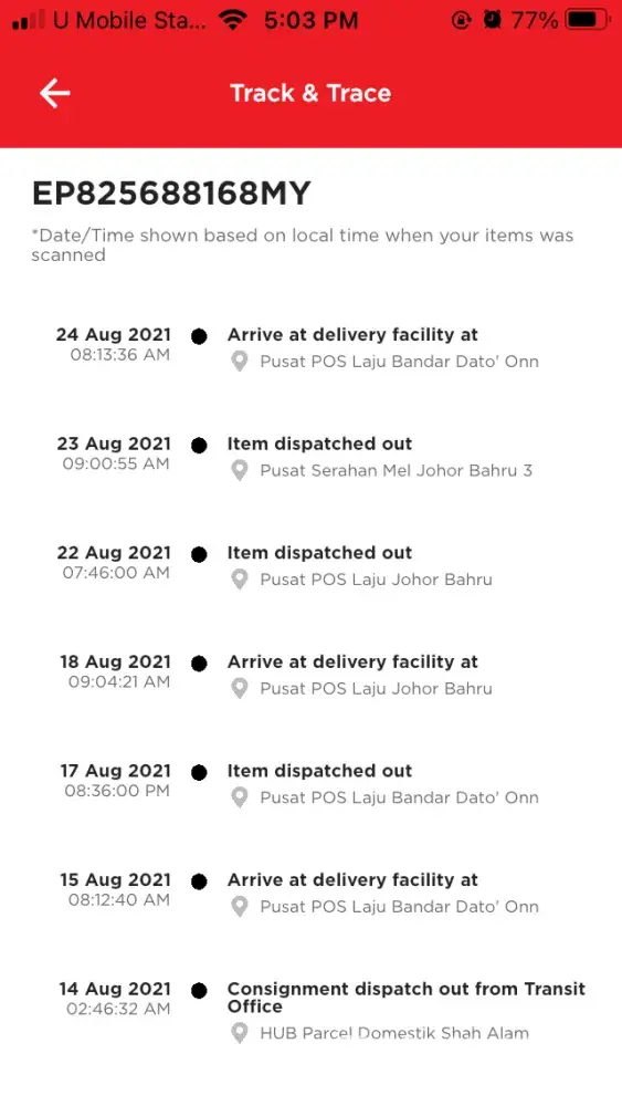 Parcel Pending at POSLAJU DATO ONN ( 1/Sept - 5/Sept)