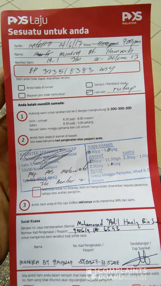 I am only 1 of the director from the co" VL Management services Sdn Bhd" need collect my document at counter-yulek with IC & show the SSM register form, but counter staff need&must me show co cop or business card. My reason co cop sure keep in office & this is new co registered on apr 2017 business card not ready yet. I only can show my IC with SSM FORM 58 confirm i am the owner for the co, but the staff also not allow me. ask me go back office bring co cop. And asking me how they need to answer to auditor is internal audit. This is my responsible to help they answer it? i feel the staff want push the mistake to me. I very angry why i need back office bring co cop, this is not my mistake! in the notice from poslaju asking me go counter with IC, Not mention to us go counter with co cop! and co cop can verify any P&C from the owner than IC? I no understand what the mention from the counter. i keep ask reason the few staff just said i scold they and don't entertain me. That why i only can write in & call to compliant the staff services. Poslaju is services line should need gv us better services. And the staff not qualify be counter staff if they can't entertain client with pressure. If they have KPI i hope management will take serious action on their services to us, because we are client and pay money for u all. Not pay money still need go counter collect documents with face the bad services & waste our time.