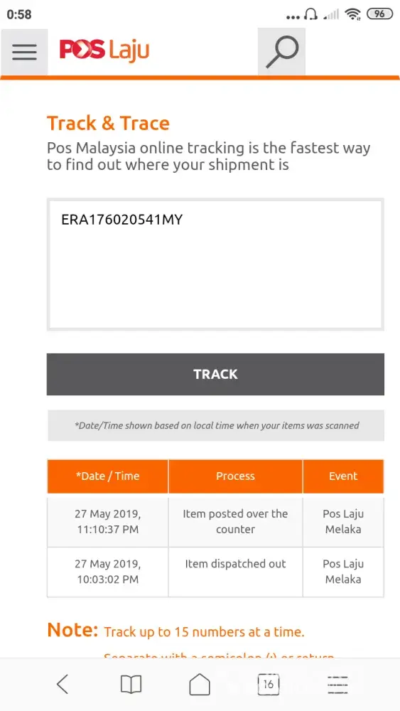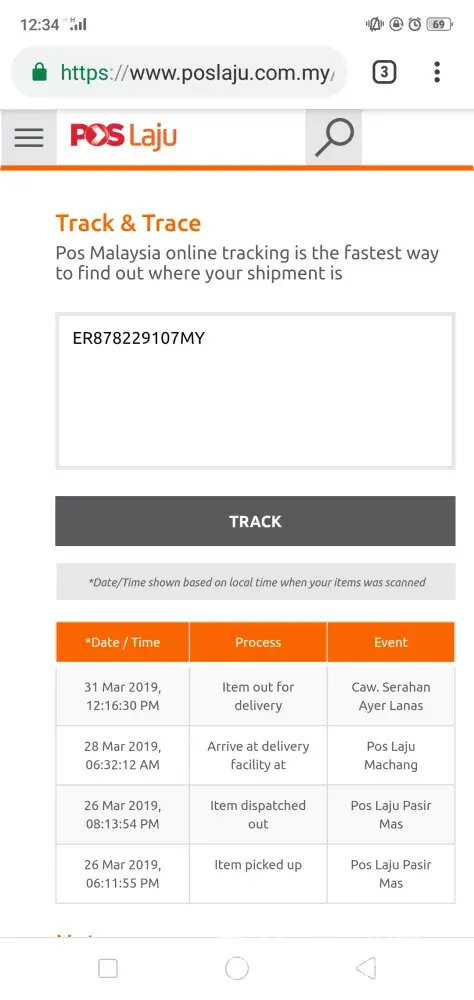 Saya datang ke pejabat pos laju untk ambil barang saya. Meringan kan kerja pengeposan encik2 van. Tapi encik bhgian track brang tak jalankn tugas. Saya smpai ke pjbt dia cakap barang pos dh kluar kan.tapi tak ade pon sampai sedangkan dia malas untk check tracking num. Sy check sndri msih xkluarkan lgi. Sy nak pakai brg tu hrini. Masalah!