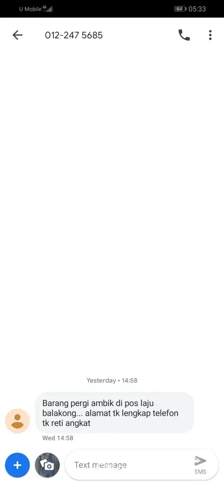 Harini saya terima panggilan daripada staff pos laju tentang barang saya. Malangnya saya tak dapat angkat disebabkn dalam meeting dan staff ada tinggalkn pesanan melalui sms.. Kata2 yg tak sepatutnya keluar dari seorang staff kepada pelanggan. Mohon ambil tidakan sewajarnya atau beri pengajaran yg sepatutnya.