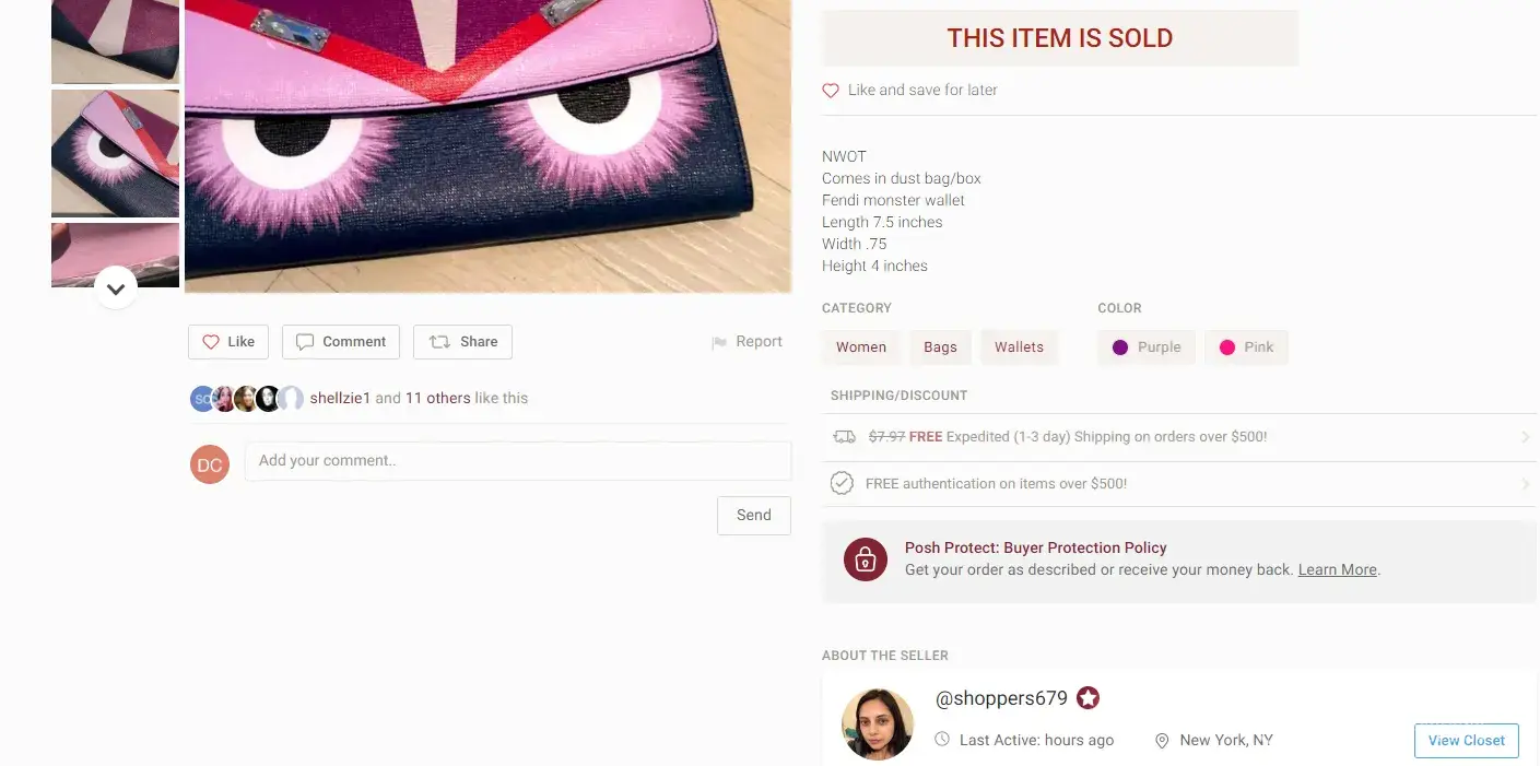 I ordered a Fendi Wallet for my Fiance' birthday and was immediately billed. It was eight days later and a dozen messages to Poshmark and the seller wanting to know the status of the order, and to date have not received a respose from either. I have been frauded by @shoppers679. DO NOT buy from this person. It is a scam and Poshmark does not care.