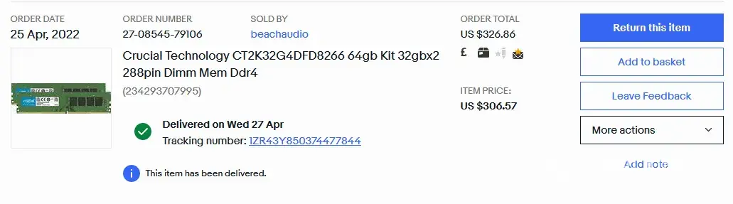 In addition, I gave them the UPS tracking number that the eBay seller provided, which clearly shows that the RAMS were delivered (tracking number 1ZR43Y850374477844, signed for by "J**h").