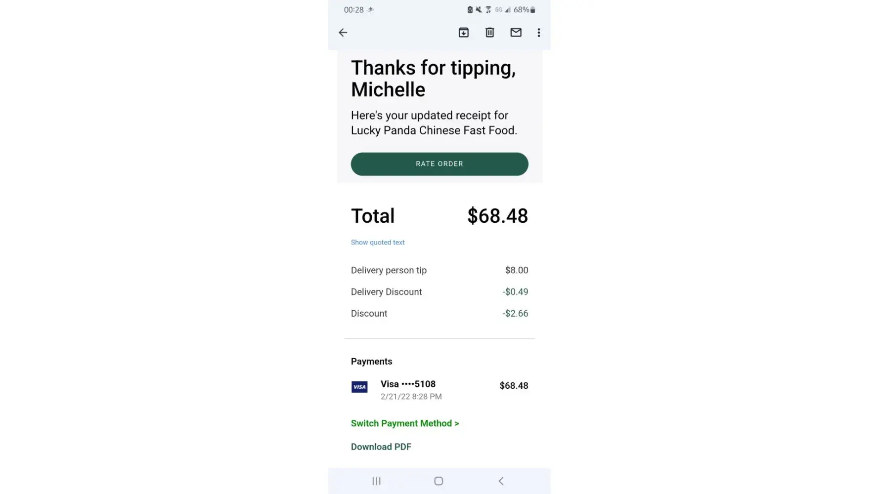 Total $29.98September 28, 2021Thanks for tipping, RobertaHere's your updated receipt for Wendy's (190 WEST FOOTHILL BLVD).Total$29.9816 PC. Crispy Chicken Nuggets$2.57SauceButtermilk Ranch Sauce $0.001Dave's Double®$6.92BunPremium Bun $0.00CondimentsKetchup $0.00Mayonnaise $0.00VeggiesLettuce $0.00Crinkle Cut Pickles $0.00Sweet Onion $0.00Tomato $0.00CheeseAmerican Cheese Slice $0.001French Fries$2.34Choose SizeSmall Fries $0.00CondimentsSalt $0.001Classic Chocolate Frosty®$1.75Choose SizeSmall Chocolate Frosty® $0.001Dave's Double®$6.92BunPremium Bun $0.00CondimentsNo Ketchup $0.00No Mayonnaise $0.00VeggiesNo Lettuce $0.00No Crinkle Cut Pickles $0.00No Sweet Onion $0.00No Tomato $0.00CheeseAmerican Cheese Slice $0.00Subtotal$20.50Priority Delivery$1.89Tax$2.10Service Fee$3.49Delivery Fee $0.49Delivery person tip$2.00Promotion-$0.49Amount Charged•••• 6944Switch$29.98Download PDFYou ordered from Wendy's (190 WEST FOOTHILL BLVD)Delivered to140 N 5th Ave, Monrovia, CA 91016, USDelivered by ShuaiTotal $14.78September 28, 2021Thanks for tipping, RobertaHere's your updated receipt for Wendy's (190 WEST FOOTHILL BLVD).Total$14.781Dave's Double®$6.92BunPremium Bun $0.00CondimentsKetchup $0.00Mayonnaise $0.00VeggiesLettuce $0.00Crinkle Cut Pickles $0.00Sweet Onion $0.00Tomato $0.00CheeseAmerican Cheese Slice $0.001Dave's Double®$6.92BunPremium Bun $0.00CondimentsNo Ketchup $0.00No Mayonnaise $0.00VeggiesNo Lettuce $0.00No Crinkle Cut Pickles $0.00No Sweet Onion $0.00No Tomato $0.00CheeseAmerican Cheese Slice $0.001French Fries$2.34Choose SizeSmall Fries $0.00CondimentsSalt $0.001Classic Chocolate Frosty®$1.75Choose SizeSmall Chocolate Frosty® $0.0016 PC. Crispy Chicken Nuggets$2.57SauceButtermilk Ranch Sauce $0.00Subtotal$20.50Tax$2.10Service Fee$3.49Delivery Fee $0.49Delivery person tip$0.20Promotion-$12.00Amount Charged•••• 6944Switch$14.58•••• 6944Switch$0.20A temporary hold of $14.58 was placed on your payment method •••• 6944. This is not a charge and will be removed. It should disappear from your bank statement shortly. Learn MoreDownload PDFYou ordered from Wendy's (190 WEST FOOTHILL BLVD)Delivered to134 Peppertree Ln, Monrovia, CA 91016, USDelivered by JessicaTotal $27.98September 28, 2021Thanks for ordering, RobertaHere's your receipt for Wendy's (190 WEST FOOTHILL BLVD).Total$27.9816 PC. Crispy Chicken Nuggets$2.57SauceButtermilk Ranch Sauce $0.001Dave's Double®$6.92BunPremium Bun $0.00CondimentsKetchup $0.00Mayonnaise $0.00VeggiesLettuce $0.00Crinkle Cut Pickles $0.00Sweet Onion $0.00Tomato $0.00CheeseAmerican Cheese Slice $0.001French Fries$2.34Choose SizeSmall Fries $0.00CondimentsSalt $0.001Classic Chocolate Frosty®$1.75Choose SizeSmall Chocolate Frosty® $0.001Dave's Double®$6.92BunPremium Bun $0.00CondimentsNo Ketchup $0.00No Mayonnaise $0.00VeggiesNo Lettuce $0.00No Crinkle Cut Pickles $0.00No Sweet Onion $0.00No Tomato $0.00CheeseAmerican Cheese Slice $0.00Subtotal$20.50Priority Delivery$1.89Tax$2.10Service Fee$3.49Delivery Fee $0.49Promotion-$0.49A temporary hold of $27.98 was placed on your payment method •••• 6944. This is not a charge and will be removed. It should disappear from your bank statement shortly. Learn MoreDownload PDFThis is not a payment receipt. It is an order summary to acknowledge the completion of the order. You will receive an order receipt when the payment is processed with payment information.You ordered from Wendy's (190 WEST FOOTHILL BLVD)Delivered to140 N 5th Ave, Monrovia, CA 91016, USDelivered by ShuaiTotal $29.98September 28, 2021Thanks for tipping, RobertaHere's your updated receipt for Wendy's (190 WEST FOOTHILL BLVD).Total$29.9816 PC. Crispy Chicken Nuggets$2.57SauceButtermilk Ranch Sauce $0.001Dave's Double®$6.92BunPremium Bun $0.00CondimentsKetchup $0.00Mayonnaise $0.00VeggiesLettuce $0.00Crinkle Cut Pickles $0.00Sweet Onion $0.00Tomato $0.00CheeseAmerican Cheese Slice $0.001French Fries$2.34Choose SizeSmall Fries $0.00CondimentsSalt $0.001Classic Chocolate Frosty®$1.75Choose SizeSmall Chocolate Frosty® $0.001Dave's Double®$6.92BunPremium Bun $0.00CondimentsNo Ketchup $0.00No Mayonnaise $0.00VeggiesNo Lettuce $0.00No Crinkle Cut Pickles $0.00No Sweet Onion $0.00No Tomato $0.00CheeseAmerican Cheese Slice $0.00Subtotal$20.50Priority Delivery$1.89Tax$2.10Service Fee$3.49Delivery Fee $0.49Delivery person tip$2.00Promotion-$0.49Amount Charged•••• 6944|Switch$29.98Download PDFYou ordered from Wendy's (190 WEST FOOTHILL BLVD)Delivered to140 N 5th Ave, Monrovia, CA 91016, US