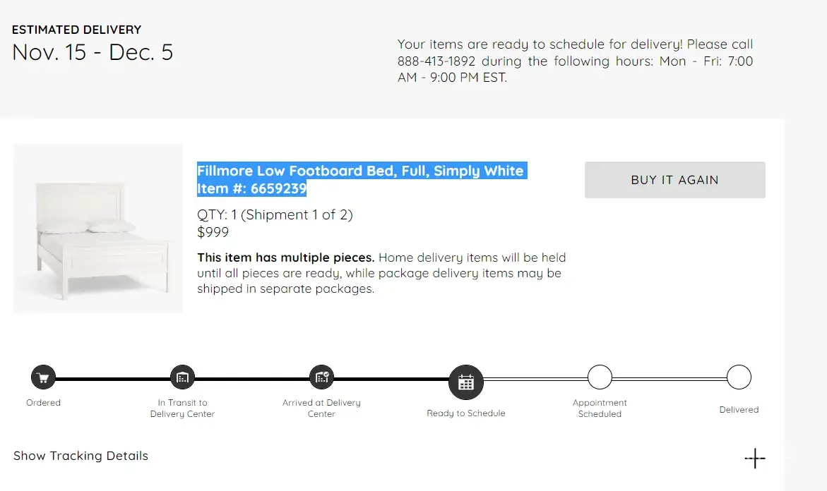 The website also says that the bed is ready to be scheduled for delivery (see screenshot) however when you call to scheudle - they are unable to schedule becuase they are missing the headboard on the bed. Despite asking several times to just send a new bed (rather than the try to find the "part on the dock" - they have been unable to do so. Online - it shows that the bed is currently in stock for immediate shipping.