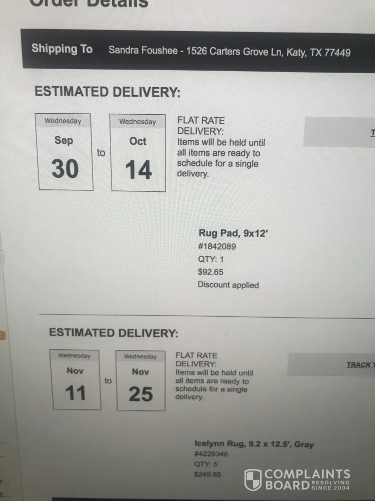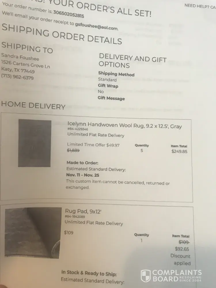 I called next day, 9/11 and talked to Prince, a customer service rep. I told him I would need to talk to the supervisor since I believe that this might escalate. He asked me for Account numbers first, then mentioned that he could help me himself with my order. I told him the situation and he said that he would be able to re-order them for me with no problem. No supervisor would be needed. He re-ordered five rugs for me and two for my daughter Lyndsey. Credit cards were provided for both transactions and assured me I would be receiving my rugs. I was first told that my rug would arrive around October 16 to Katy, Texas and Lyndsey‘s rug would arrive around November 2nd to California. He mentioned there was some type of problem with first order, but no problem with this one. Lyndsey received her email confirmation and I did not.