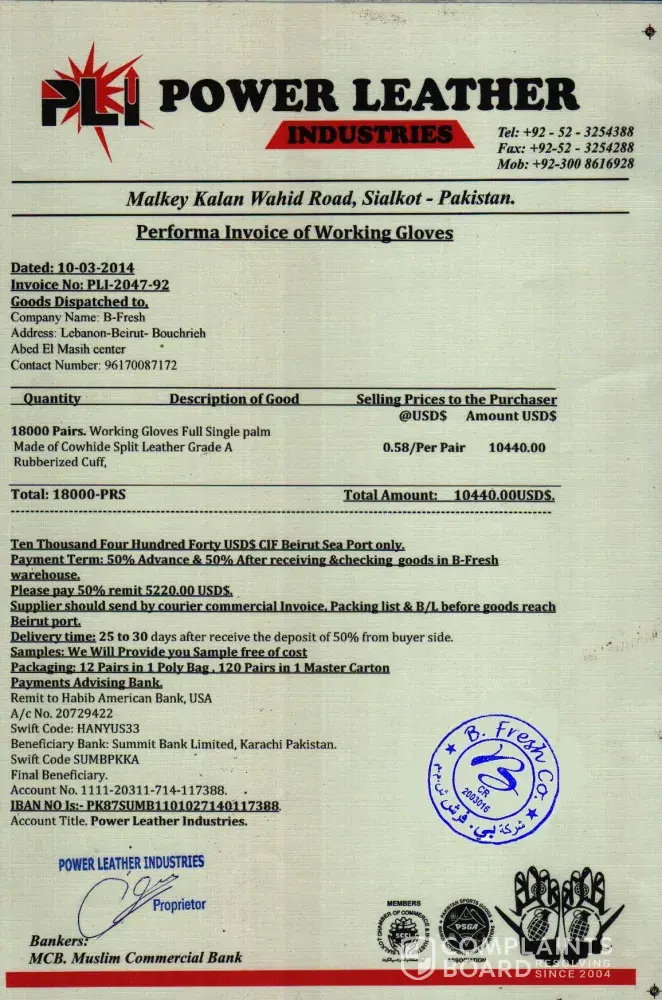 A recent business fraud happened to us, we are Bahrain based Trading & Distribution business and had a requirement of Leather Gloves, where our search over the internet for a suitable supplier brought us in contact with Mr. Mian Qaiser Mehmood of M/s. Power Leather Industries, Sialkot, Pakistan from whom we received a sample of the required product which was approved by our client. Following sample approval, after long negotiations we agreed on payment terms as “Cash Against Document†and we confirmed our order with them for 80, 000 pairs of Chrome Leather Palm Gloves worth $46, 256/-. However, they dispatched 88, 000 pairs of Chrome Leather Palm Gloves worth $50, 864/- and we accepted the bank advice to release the payment and hand us the shipping documents to clear the consignment. Once the consignment was cleared, the whole 20’container was taken directly to customer premises. However, when the same was opened, on inspection, the goods were found to be totally wrong, instead of Leather Gloves, we received Cotton gloves of very poor quality (Picture attached) which are non-usable due to which the client has rejected the entire consignment. We have tried to contact Mr. Mian Qaiser Mehmood, but all our efforts have gone in vain. Hence, we urge all readers to take maximum care while approaching / dealing with below listed company / person for your immediate reference: Power Leather Industries Wazirabad Road Sambrial, Sialkot Pakistan Phone : +[protected] Fax : [protected] Email : [protected]@powerleatherind.com, [protected]@hotmail.com Web: www.powerleatherind.com Mr. Mian Qaiser Mehmood contacts are [protected] / [protected] or [protected]