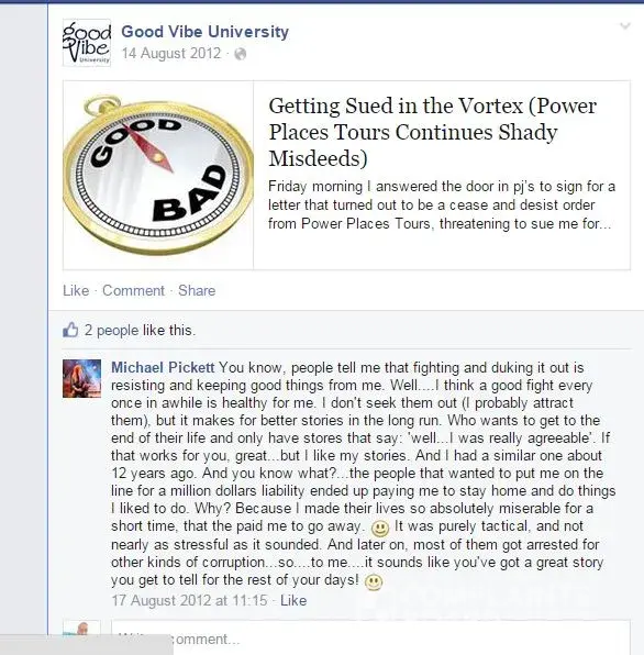 I also want to help my friend and spiritual mentor Free Spirit who put himself in great personal and legal danger to tell the world about what Power Places Tours are doing. They threatened him with prison but he stood up for himself. He refused to lie to PC and other review sites, so that others could use the evidence to win their SLAPPs.