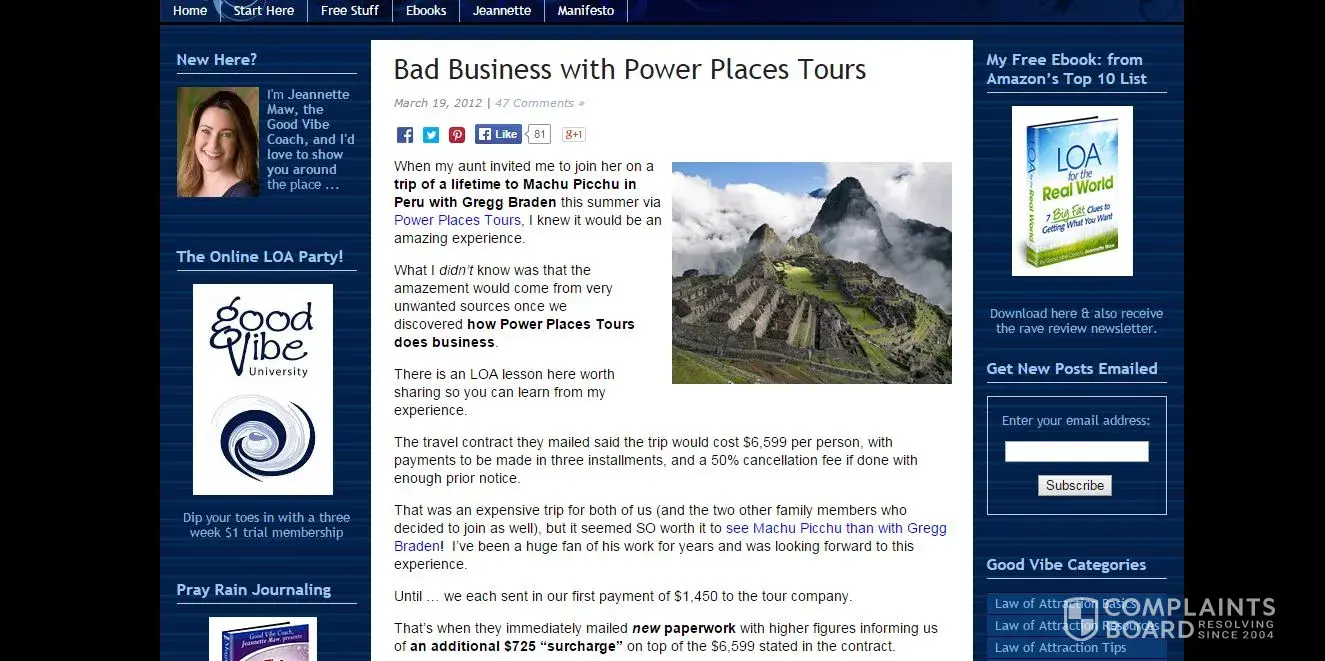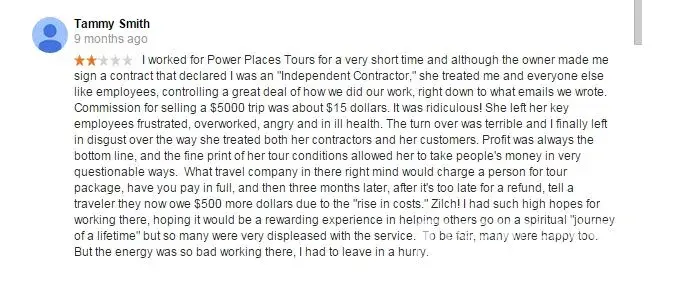 There is also much record on the internet of very many people being cheated or harmed by Power Places Tours in numerous ways.