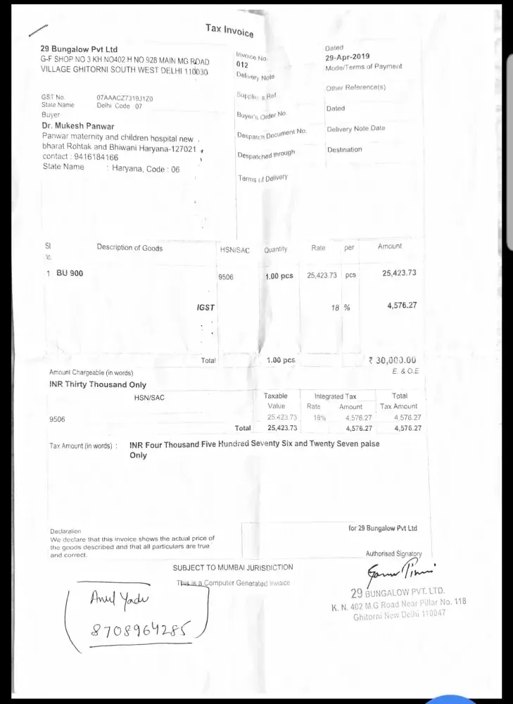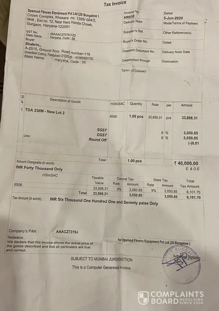 I have purchased the Air bike BU 201 from Bansal sports on 25th June'2021 vide invoice no. 232/21-22.