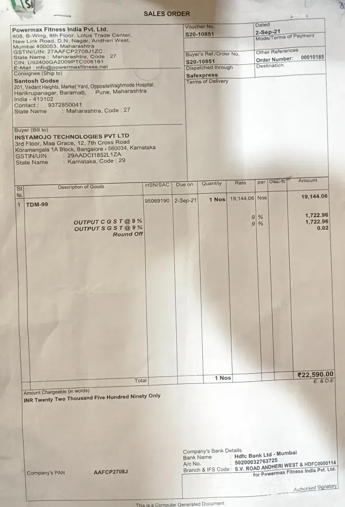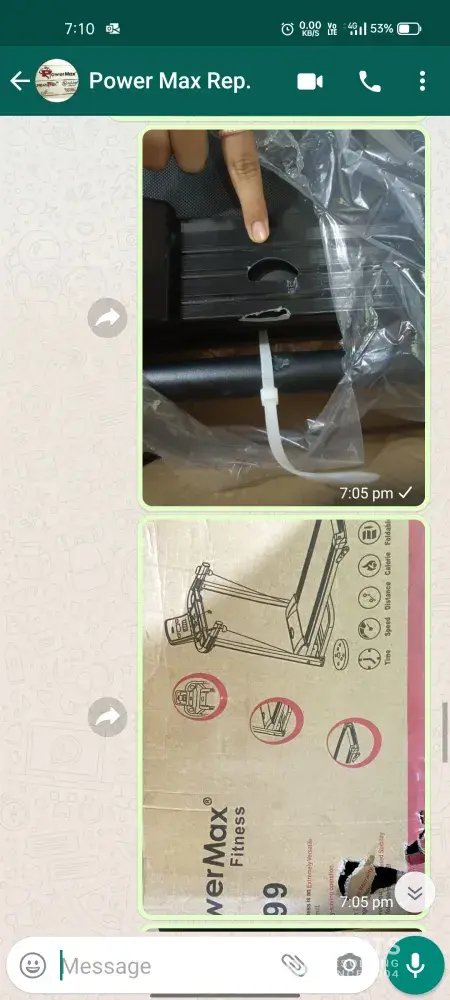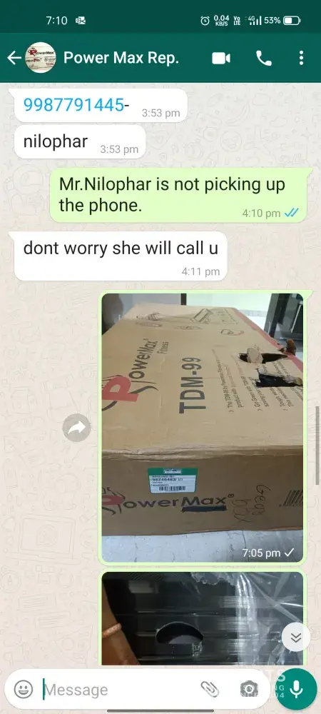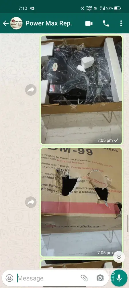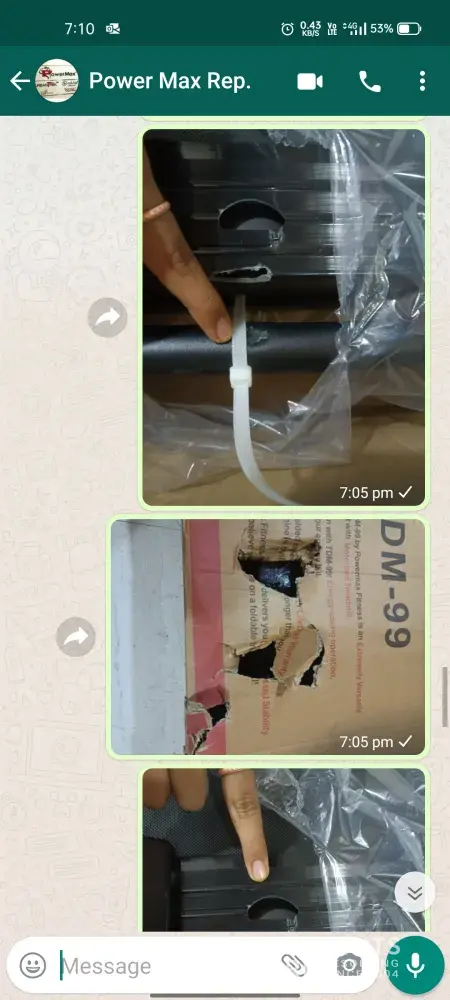 From: Nihal Godse Date: Mon, 6 Sep 2021, 7:51 pm Subject: Recived Damaged Product To: Sir/Madam, I ordered Powermax TDM-99 on 31st August 2021 and recived it today by SafeExpress Shipping Services. But the product I recived was already damaged. There was a damage to the bottom frame and handle bar of the treadmill. Also the box was damaged badly. This was 1st time I ordered from your website. We order the products from official company website with TRUST that I would recive good quality product. But I get the damaged one. I was totally out of my mind due to this. 1st impression of your company was unexpected. Hereby I request you to look into my problem and resolve immediately. Damage Pics & Bill attached