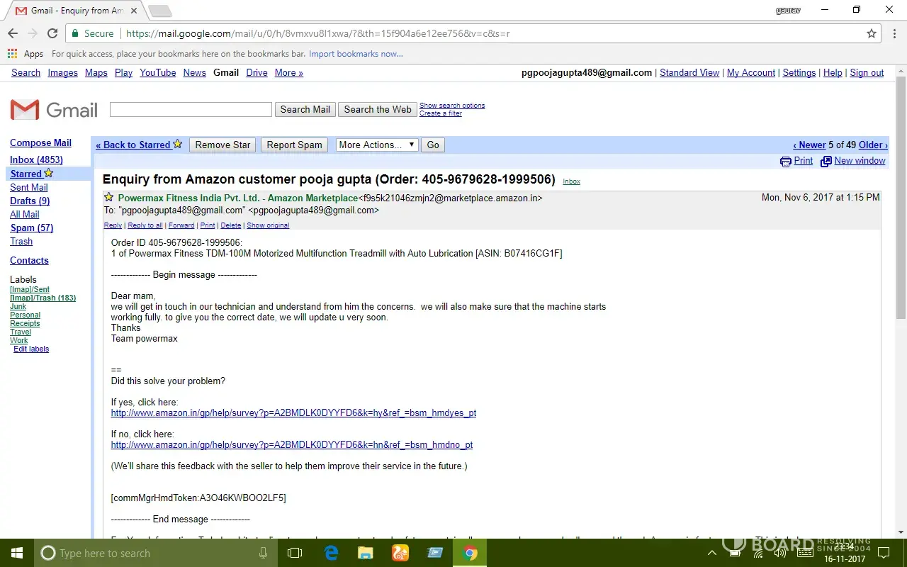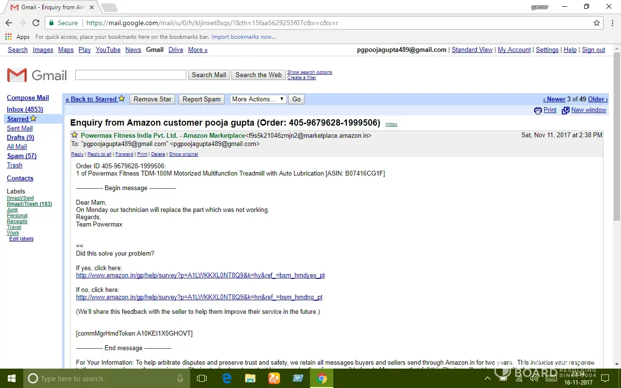 I purchased powermax treadmill model tdm-100m from amazon.in on 22/09/17, product delivered on 28/09/17.