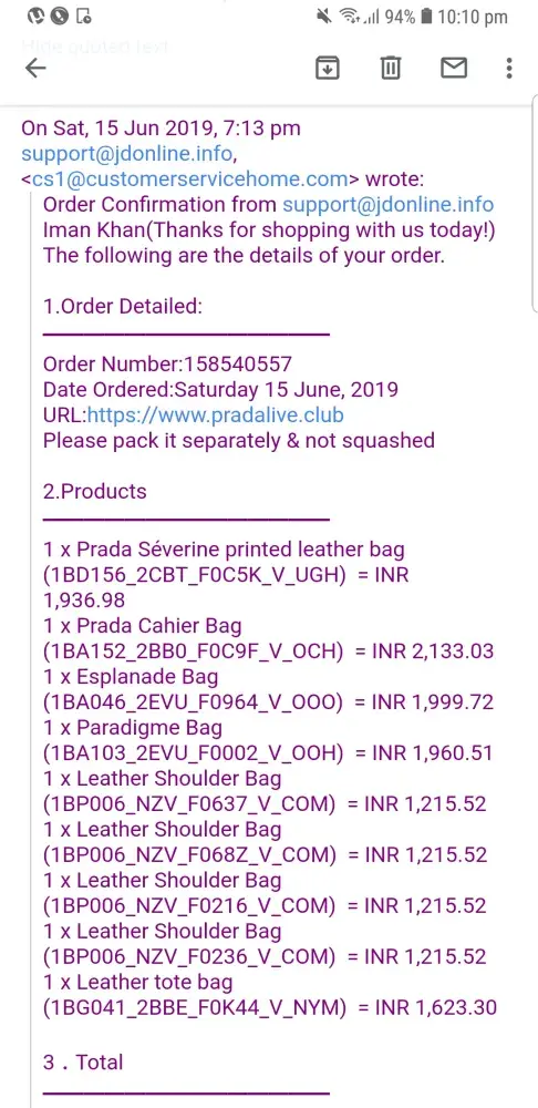I had ordered few bags from pradaliveclub on 15th june and done complete online payment for my order and I received the confirmation mail but after that no msg or mail from the site. I have written tons of mails but no reply. I really needed those bags asap but It has been more than a month now. Why charge & not send the product. For a big Brand like Prada this is really shocking and shameful. I have sent the images of the order confirmation. Really upset with the service