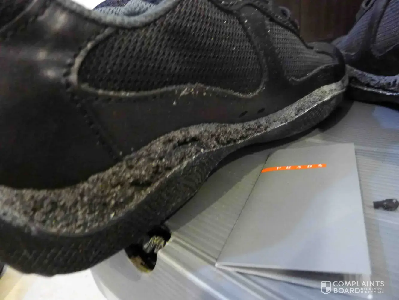 I purchased a pair of mens size 12 black shiny sneakers for my son at the cost of 420 dollars. I purchased them just over one year ago at woodbury commons. A month ago my son showed them to me as he can no longer wear them. I was shocked, The right sneaker is fine, but the left sneaker is worn on the heel and the shocking part is, the rubber is seperated from the sneaker almost halfway around the back of the sneaker. A definite defect. This is very disappointing as we all love Prada and had trust in your products.
