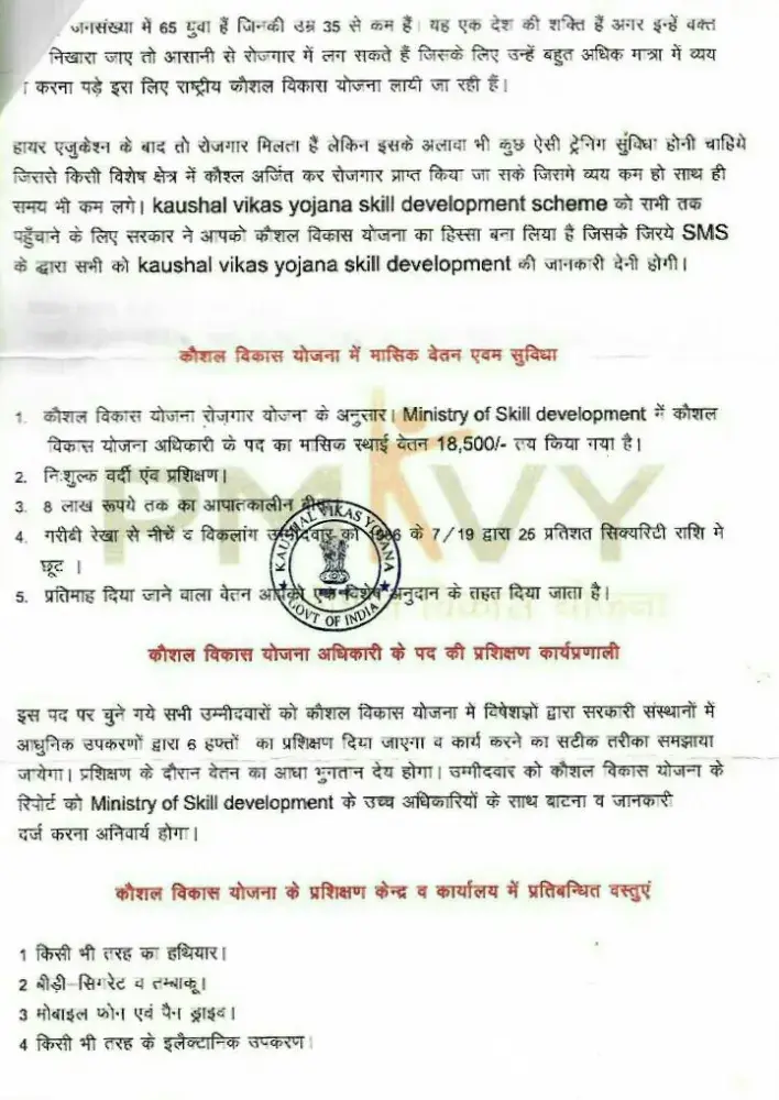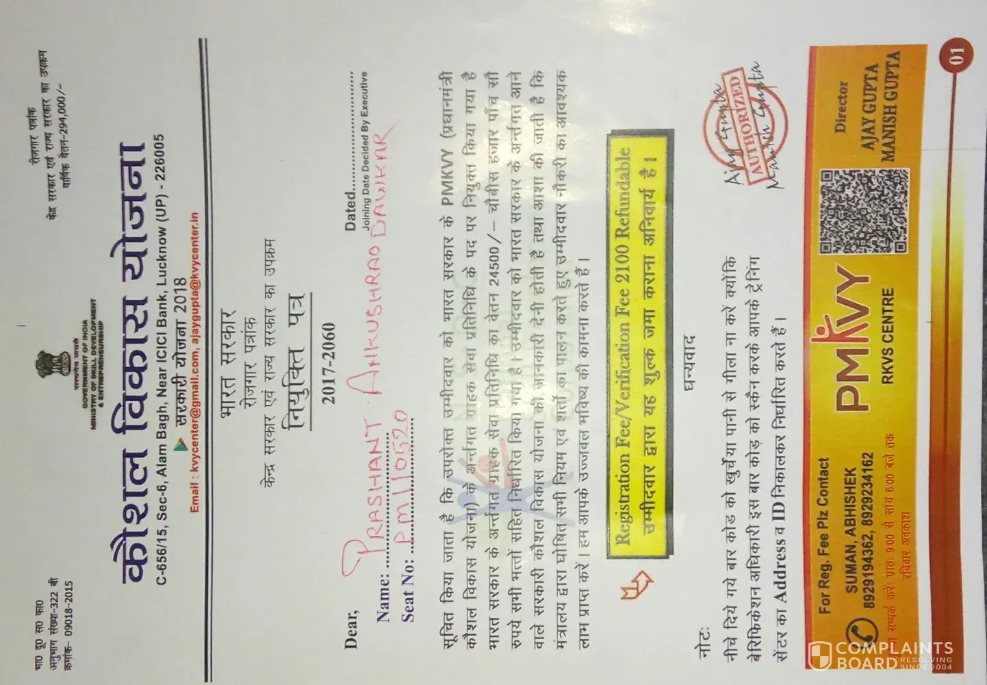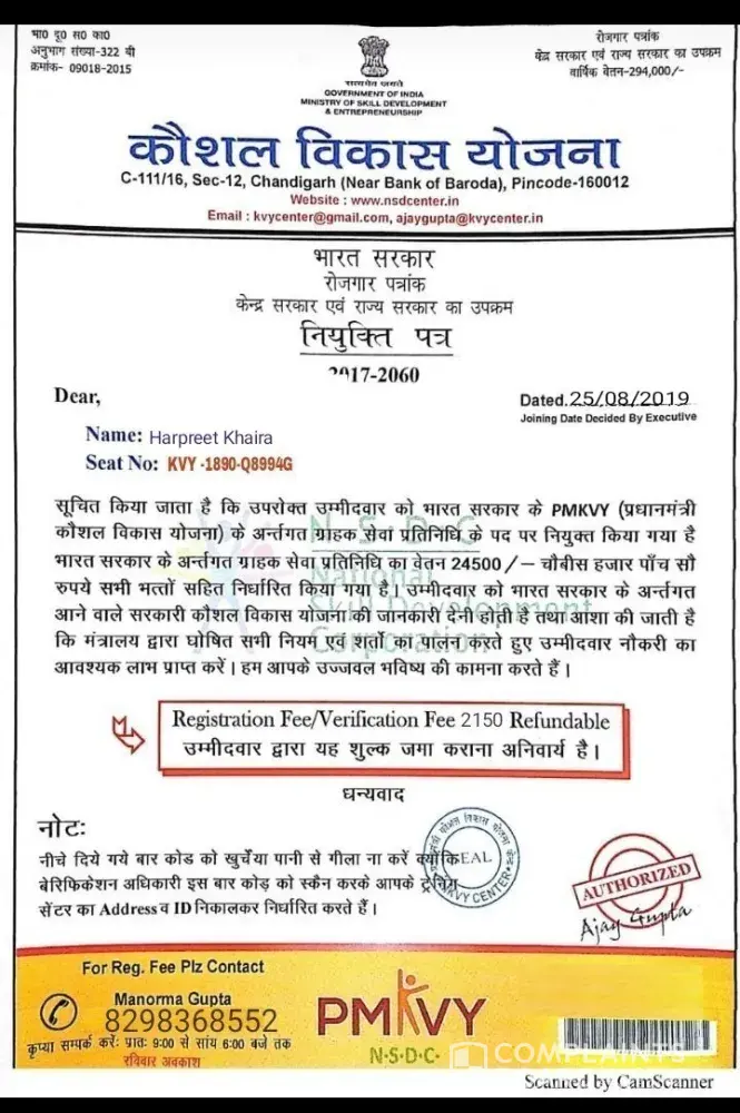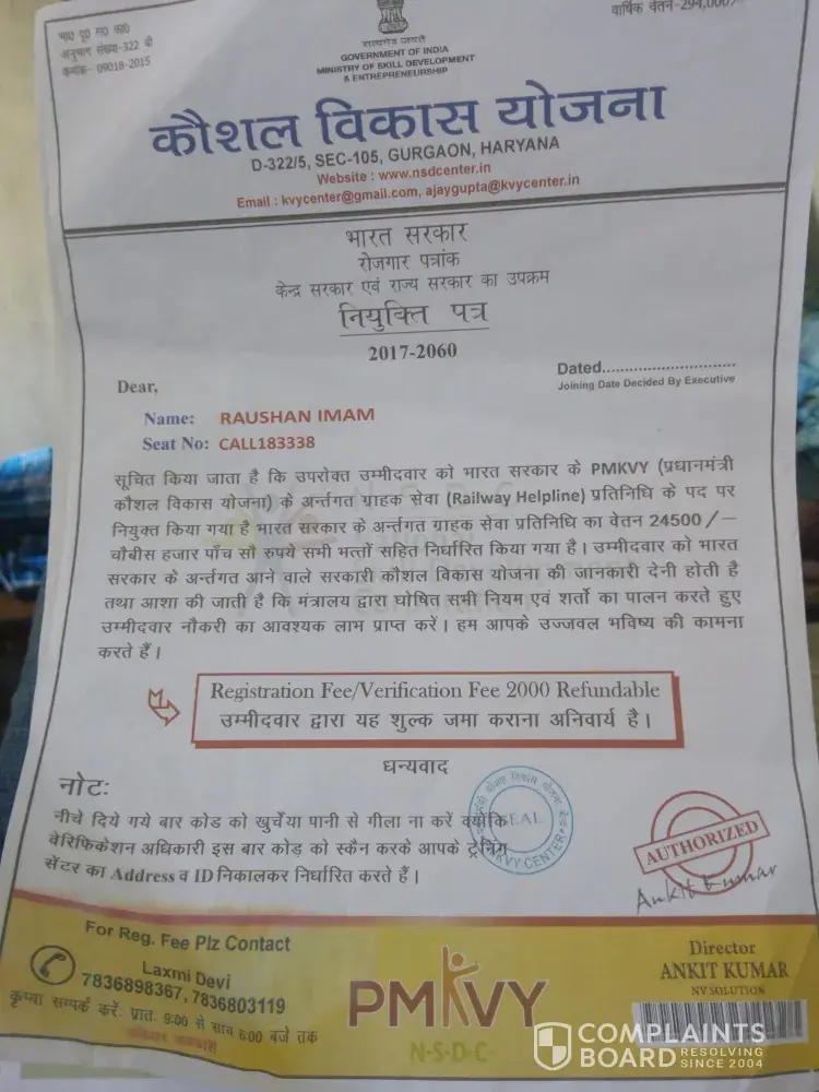 I have received by post, recruitment document under PMKVY program, post of "Customer Service Officer" salary-₹24, 500 and Registration Fee/Verification Fee ₹2100 refundable compulsory deposit by account "PMKVY Centre" Name-RKVS CENTER