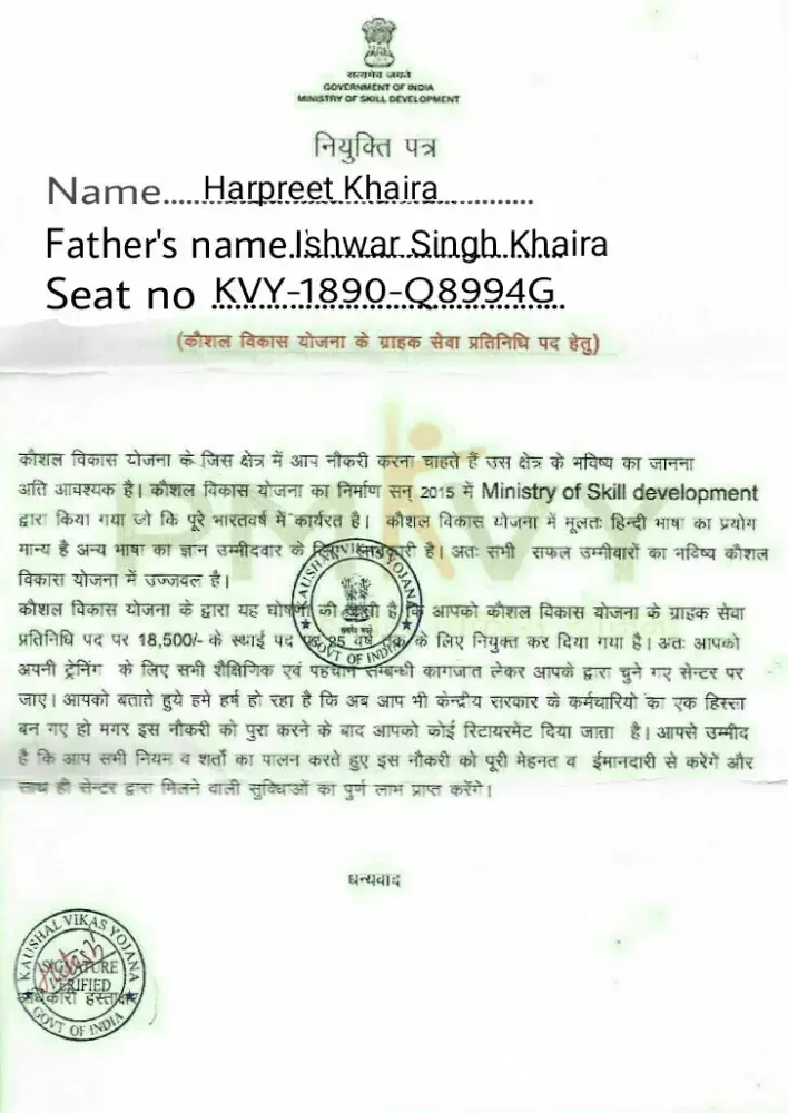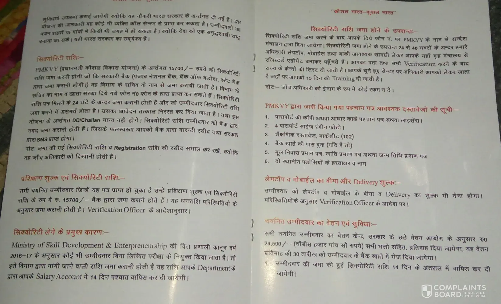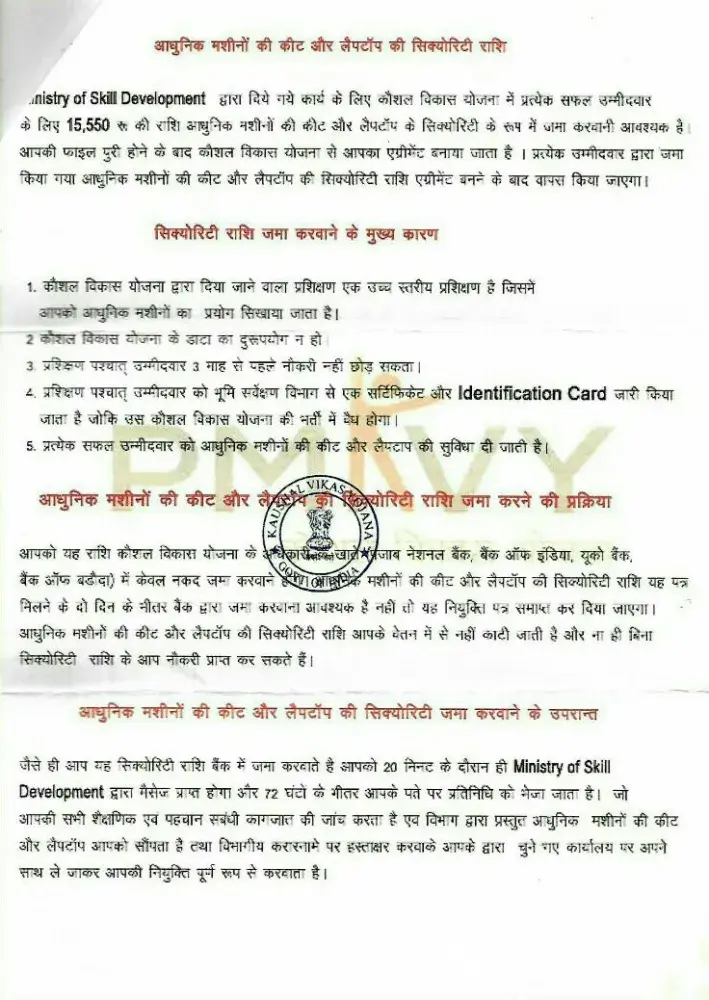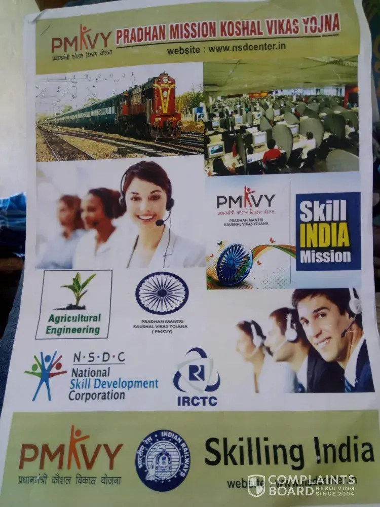 Sir mije pmkvy ji Trf se costumer care me job ka letter aaya usme res.. fees 1800 ki deposit krbane to bola fir Scorety 13500 ki fir uske bad call aayi ki life time jeevan bima ki 4500 or fir product transport fees 6500 deposit krbaya 26, 300 ki total payment kra chuke hai pmkvy se Etna dhoka dri ho chi hai or prandhnmantri so rhe hai enhe jgao plz help me my contact no [protected]