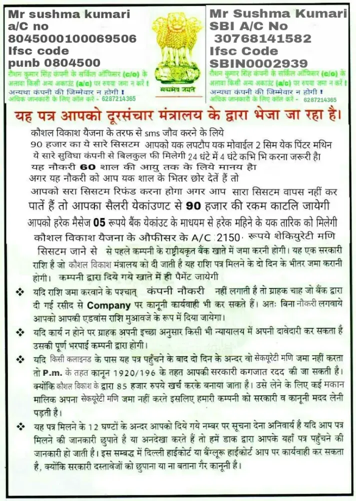 cheating Sir muje Pmkvy center F-64/312, sec-12, Gurgaon122016, Haryana se by post pratiba vikas yojna ka letter aya tha jisme govrmnt call ceter mai job dene ke bare mai tha or uske liye registration fees 2300 jma krne ke liye bola mene SBI bank se a/c no. [protected] pr amount jma kr di. Uske baad phir 12500 rs. Jma krane ko bola or phir 9500 rs total...