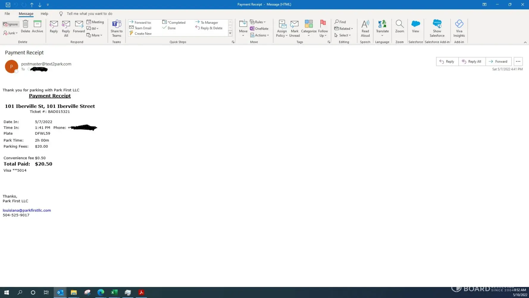 My wife and I parked at the Park First, LLC - Badine Location at 101 Iberville in New Orleans while on vacation on 5/7/22. At 1:41PM on the same day, I received confirmation that I had paid for 2 hours of parking on the mobile app under ticket # BAD015321.