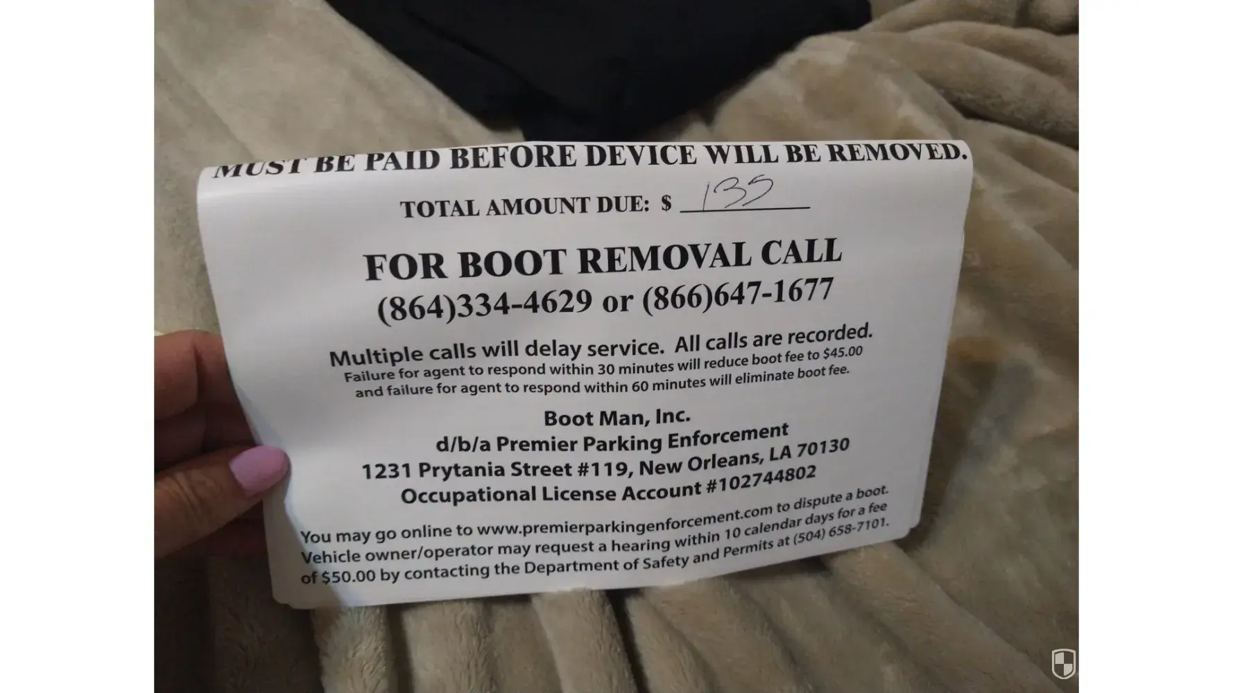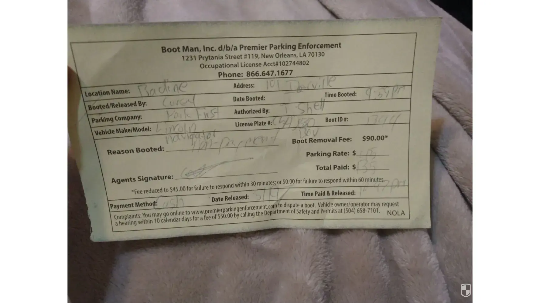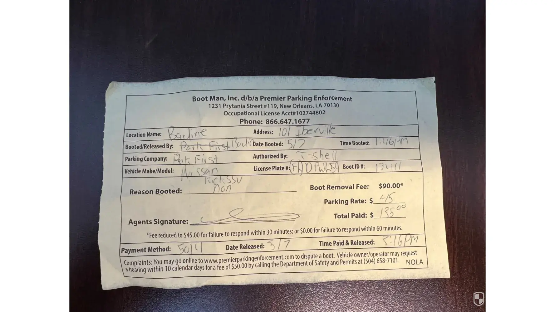 At 1:46PM on 5/7/22 we received a boot from "T-Shell" who works with Boot Man, Inc. d/b/a Premier Parking Enforcement of 1231 Prytania Street #119, New Orleans, LA 70130 under occupational license acct #[protected]. I arrived at my car at 3:16PM and had the boot ID# 13411 removed. I showed the receipt for my car's paid parking to another representative named "Bodin". He informed me that he could not undo the boot or charge even though I had valid parking. I paid the $135 fee ($90 for booth removal and $45 for parking rate). In total it cost me $155.50 ($135 fee + $20.50 parking fee via app) to park at the Park First, LLC lot that day.