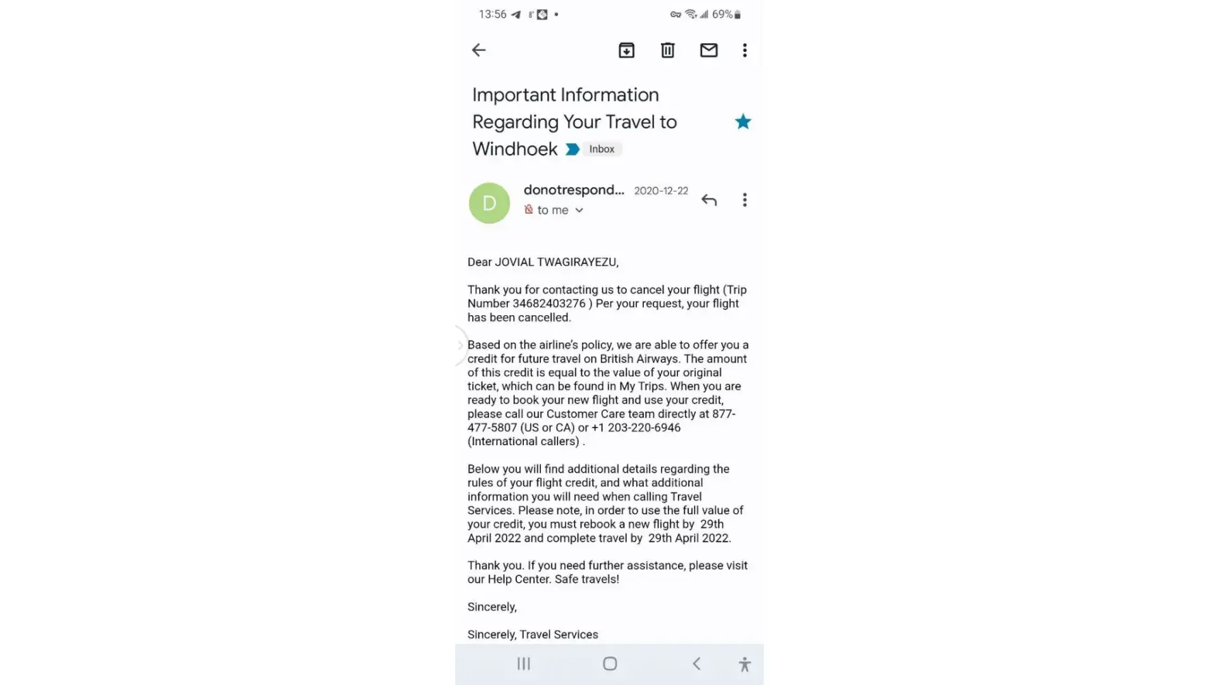 Therefore, in December 2020 I bought a round ticked from Toronto - Canada to Windhoek -Namibia for CAD 1220.98, but due to Delta variant, the Goverment of Canada suspended all comercial flight linking Canada and UK and as result my flight was cancelled, however Priceline gave me flight Credit to be used before 29th April 2022.