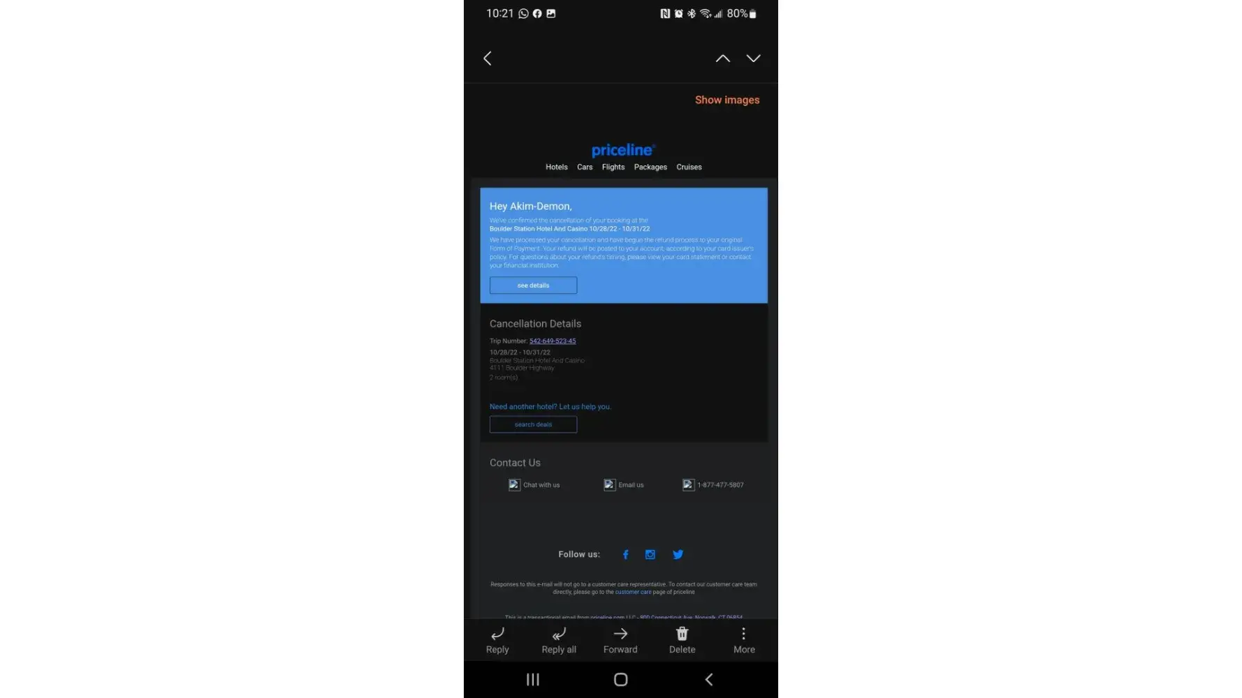 when I contacted Priceline earlier to cancel I was told that I had to contact the Hotel. When I went to the hotel I was told I would receive a refund to my credit card, but received nothing. So I called the same person at the hotel and was while he confrimed what he told me, he then told me that since I made the reservation throught priceline I had to talk with them. I have now been on hold with priceline, again, for 15 minutes after its robot found my itinerary.