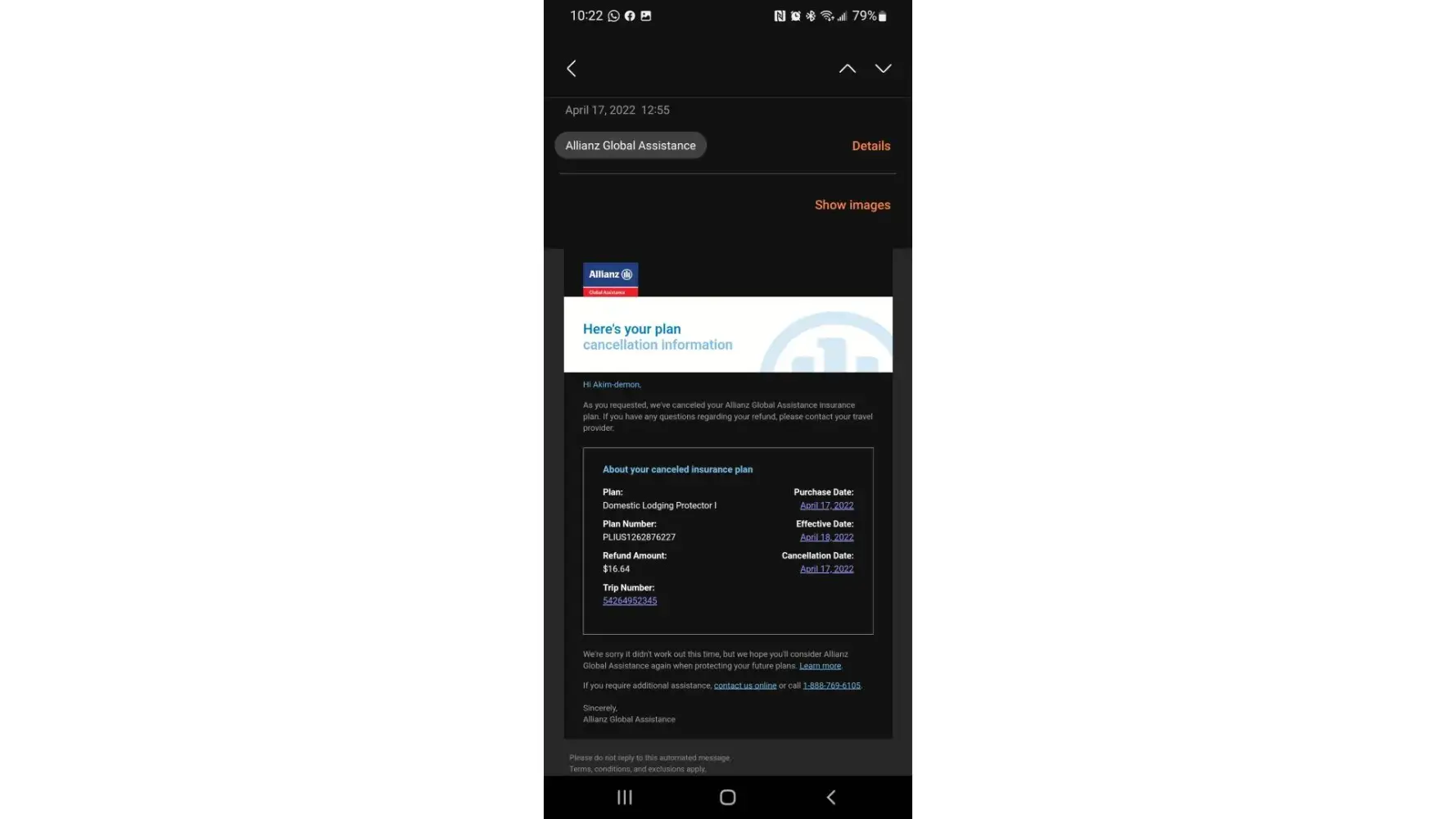 4/17/22 I accidentally booked hotel reservation for trip October 28-31st. I called immediately after trip was submitted. Trip was cancelled within 5-10 minutes of booking way under 24 hours. Received trip email along with travel trip protection email. Spoke with supervisor trip cancelled. I was supposed to receive full refund on trip including trip protection $734 and change. However trip protection (per Allianz) protection plan was active as of April 18th. Received email days later that refund amount changed to $700.80 excluding protection plans. Called back a week later and agent submitted resolution. I was supposed to get a email response with resolution which never happened. This is very upsetting. Called again was told supervisor was on a call and would call me back. Im still waiting. I have called 2 times and no resolution. This is unprofessional.