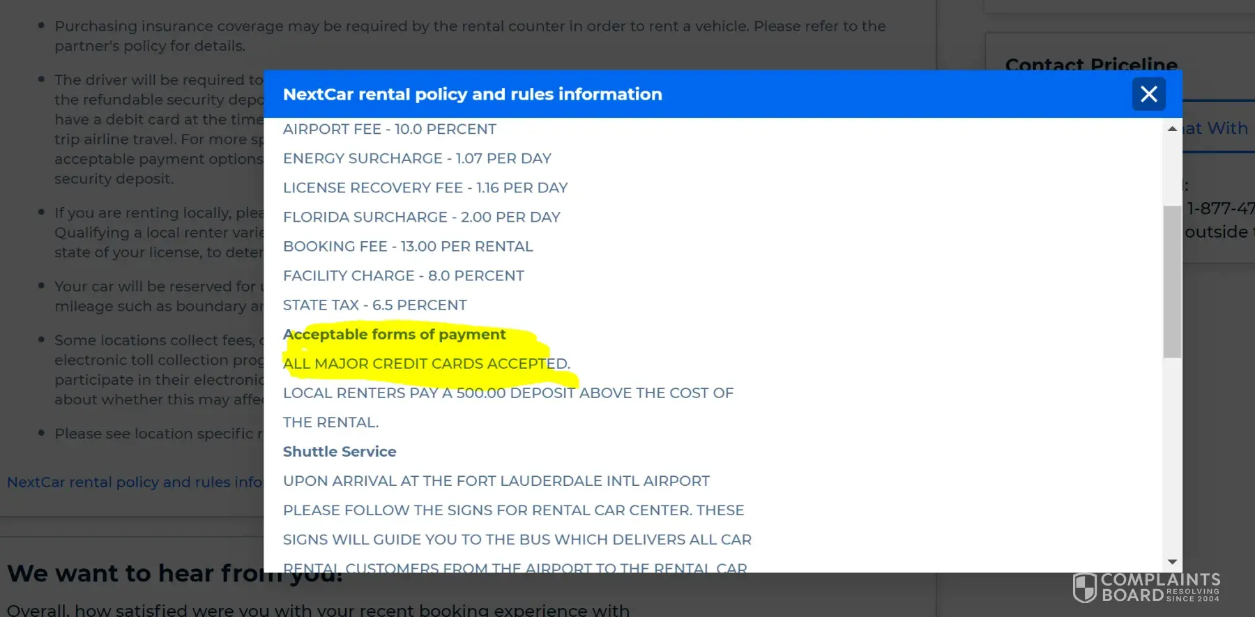 As I was unable to secure another hotel in a reasonable amount of time today, the Newport Hotel is charging me for one night's stay This is after spending over 4 hours attempting to come to some resolution with Priceline about the hotel rental and an additional 3 hours trying to come to some resolution about my car rental which was declined by the rental company due to Priceline's failure to inform me that American Express is the one major credit card that this company does not accept. Please see below for the screenshots of information about my car rental provided by Pricelines vs. the information on the car rental company's website.
