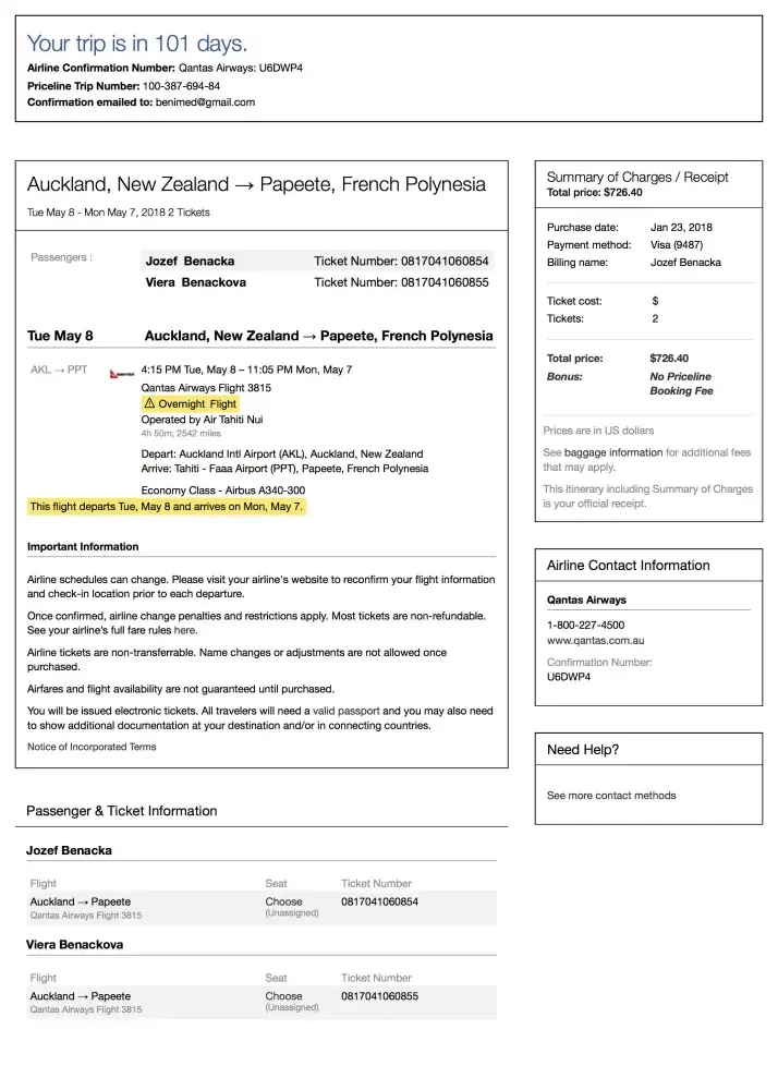 we booked and paid the connecting flight for 4 people 3815 from Auckland to Papeete on May 8th 2018 at 4:15 pm. (The names Jozef Benacka, ticket Nr. [protected], Viera Benackova, ticket Nr. [protected], Frantisek Melichac, ticket Nr. [protected] and Viera Melichacova, ticket Nr. [protected], but unfortunately was changed from 8th of May to 10th of May 2018 by your company. And its for us not acceptable, because this flight is between the other connecting flights. These flights are already paid !