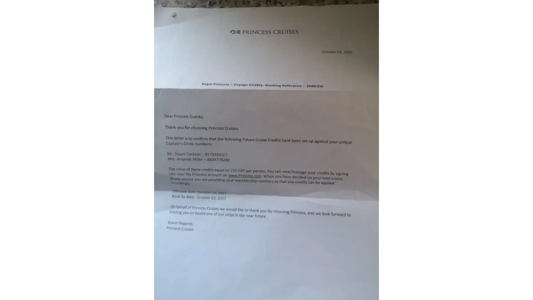 I have attached a letter from Regal Princess as we were on Voyage G128Q BR: 2H8K3W on 30th Sept 2021.