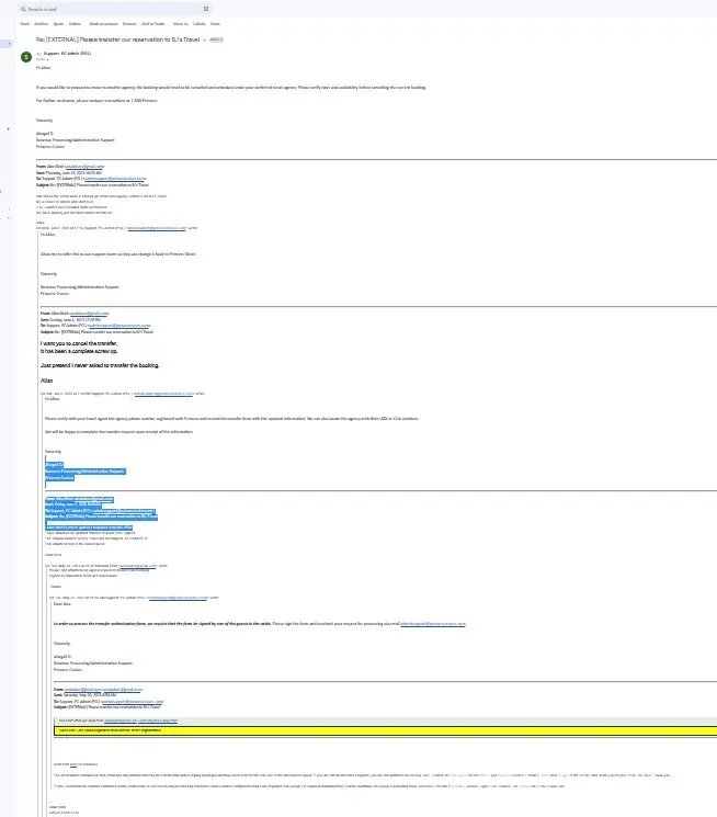 I booked a cruise for November 2023 with Princess.com. A few days after I made the booking I received an attractive offer from BJ's Travel of $500 for any cruise booked over 8 days. I called and they said yes, even if I just transferred the booking I would be eligible. I contacted Princess and they put me in contact with Abigail D. I completed the form she requested to allow the transfer and she transferred the booking to the ether. BJ's Travel cannot access it. I can access the booking on Princess.com but if I try to do anything I am told to contact BJ's Travel, but they never received the booking.