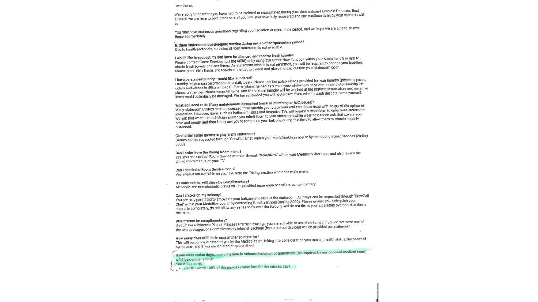 I have a complaint about Princess Cruise Line regarding statements of reimbursement and totally overlooking me with regard to respect and business ethics. There was also a total a lack of empathy and caring for me in the situation. I traveled alone on a 10 night cruise on the Emerald Princess on November 23rd 2022. I had all of my COVID 19 shots and a booster prior to sailing. I still opted not to do any shore excursions because of the fear at how the foreign countries were containing and monitoring active COVID cases at the time. I reported some symptoms of possible COVID infection early in the morning of December 1st 2022 to the ship’s medical team. I was tested at 7:15 am and got a positive result. I was informed that I was required to be put in isolation in another cabin on another level that was closer to the kitchen to receive my meals at my door easier. During that time I had no contact with a human unless by phone and was not allowed to leave my room or have visitors. A letter was left on my bed to say that they were sorry to hear that I had been isolated and in quarantine. Also in the letter is stated, “If you miss cruise days, including time in onboard isolation or quarantine (as required by our onboard medical team), you will receive an FCC (future cruise credit) worth 100% of the per day cruise fare for the missed daysâ€. Also a refundable credit for the refundable portion of taxes, fees and port expenses for ports visited after disembarkation was mentioned. I missed going to shore at Cozumel and had prepaid fees/taxes, I believe. I left the ship on December 3rd. I waited a few weeks and never heard from them, so I called and was told to contact my travel agent to put in a claim. I did and they tried to get some action and were told I would be contacted by Princess. When I wasn’t, I called myself to try to speed things up. I was told to send an email about the issue. I did this and never received a reply. I sent the first email was on December 24th. I never received a response. I called several times and was given unacceptable reasons and pushed aside to play a waiting game each time. I sent 4 additional emails, but still go no response. I then contacted the travel agent again. They called them. They were told I was to be given $67.33.
