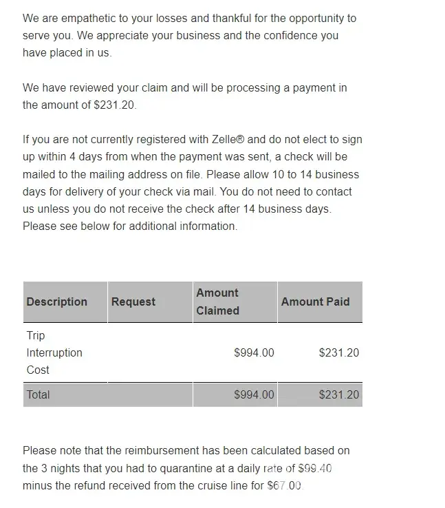 Both the agent and I were not satisfied. I had paid $99 for travel insurance through the travel agent when I purchased my cruise trip. The travel agent suggested that I should put in an insurance claim for compensation because of an interrupted trip. I did this. The travel agent awared me $298.20 ($99.40 for each of the 3 days missed), minus the $67.00.
