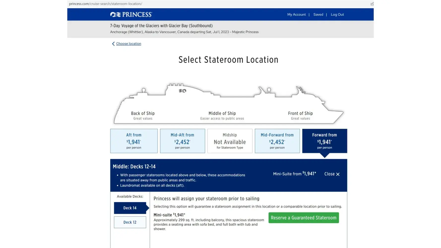 I have included a screen shot of the form used to reserve a room. It clearly indicates Decks 12 or 14 and Front of Ship. It also clearly states "guarantee a stateroom assignment in this location. We thought all was well and booked the trip.