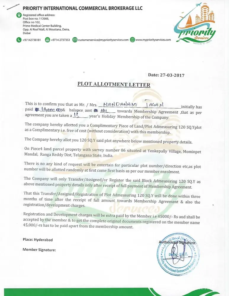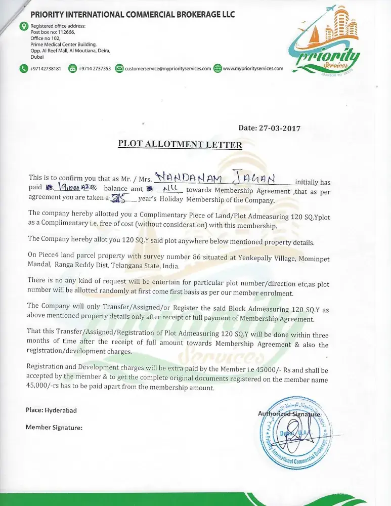 I was with priority services more than 4years and they taken from me 180000 rupees for member ship fee and they given to me complimentry plot at Mominpet but till now no plot vist yet, even they did not given plot layout i am following very long time so i am much frustrated so decide todo complaint and management very very worst. nobody helping. please take seriuos action on priority services on Hyderabad.