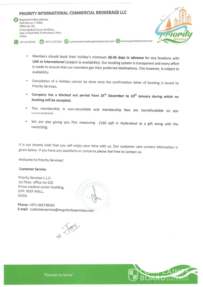 Hello People. I am a normal level headed working guy who fell into Priority LLC's trap. They were promoting themselves by luring customers with a free holiday outside Lulu supermarket. And the promoter very insistently took down my name and number. Then started the vicious cycle. We visited their office to learn more and understood that the holiday come only if u book a package with them minimum spend being 19000 AED. They create an environment of immense pressure not allowing you to take time out to think or consult and lure you with lovely looking pics of marvelous properties across globe claiming that they have tie ups with all of these.