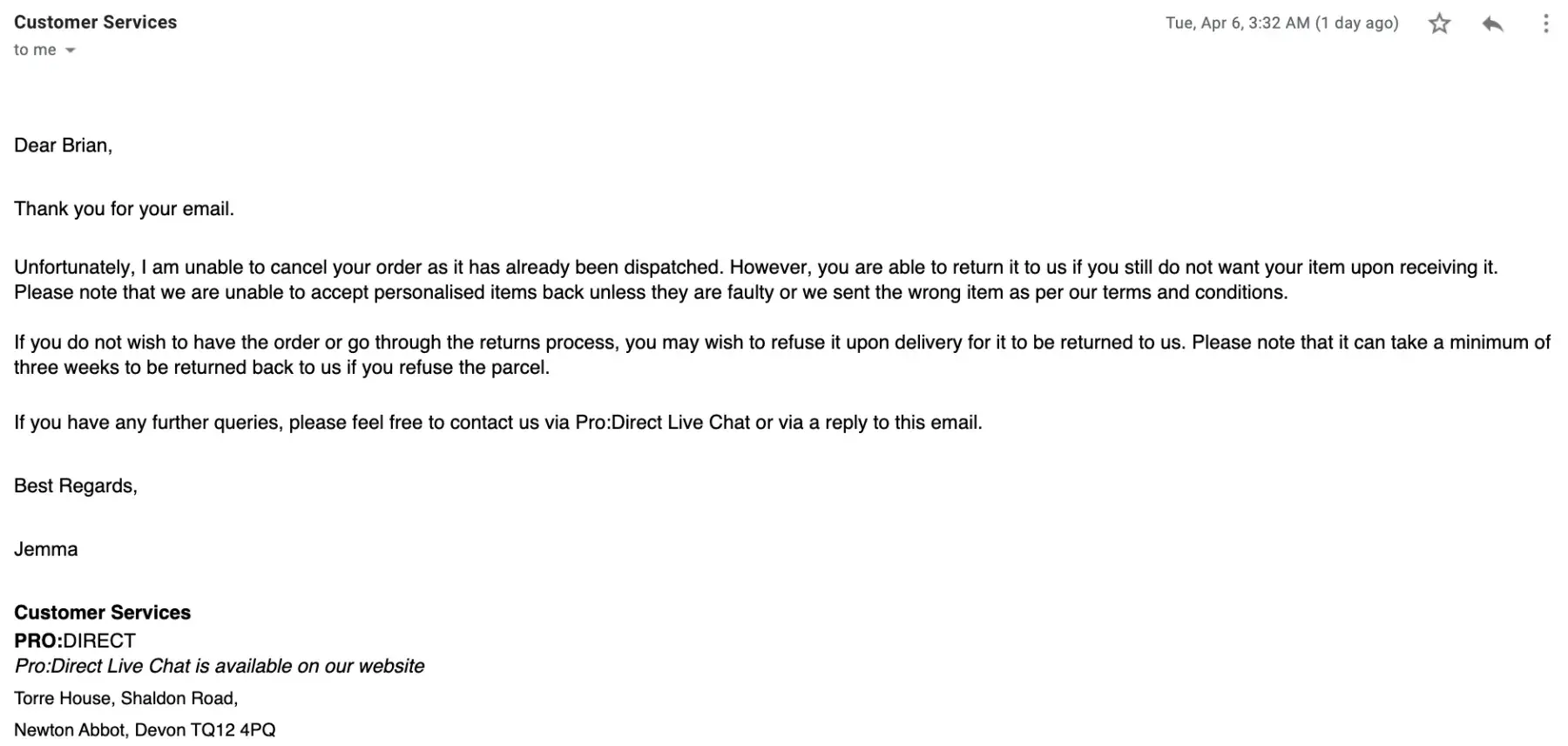 I tried to cancel the order in less than 15 minutes after placed the order online. It never went thru even I sent a couple emails to provided customer service email. A couple days later, email sent to me indicated the product was dispatched and I replied asking for cancelation. They replied email it's not possible since it was dispatched and I have to go thru the return after receiving the product. Well, they obviously would like to sell the product and careless about the consumer's concern and interest. It would be considered as an abusive business practice if a consumer would agree. Well, it is too bad that I would never come back doing business with them again and I would share my experience to the consumers out there to be very cautious when doing business with prodirectsoccer.