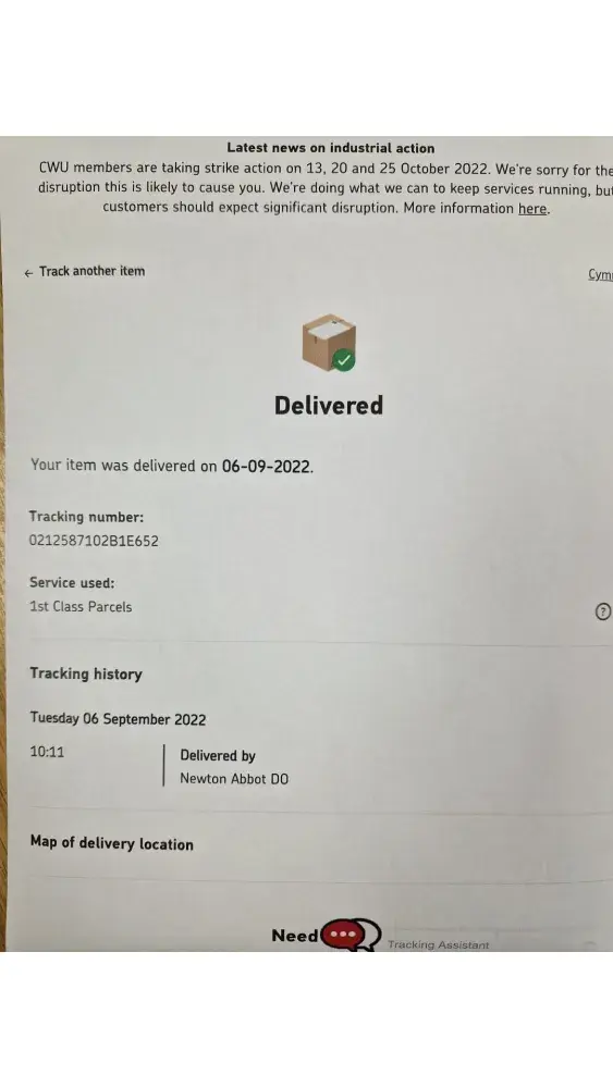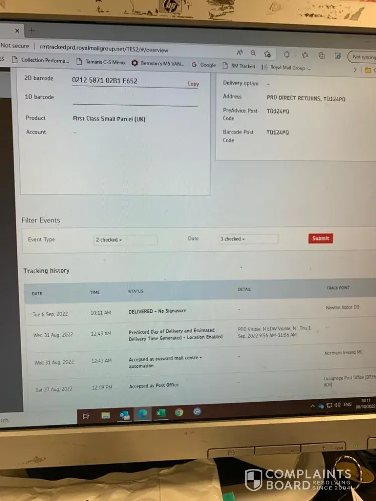 Checked with royal mail as I have my reference number. They are showing that they were delivered to them on Tuesday 6th September. I rang Royal Mail and they also said that they were delivered and given to Shannon and the correct address as the GPS shows their building and provided me with screenshots of this information which I sent on to Prodirect.