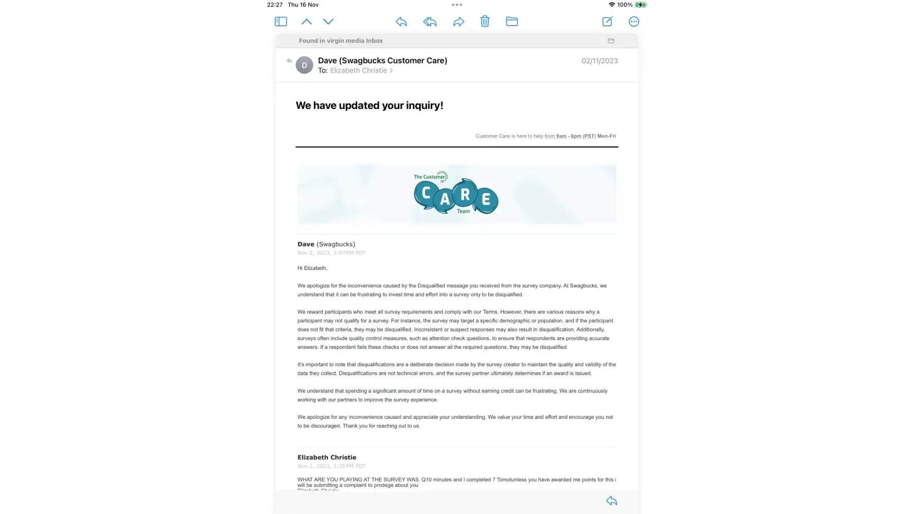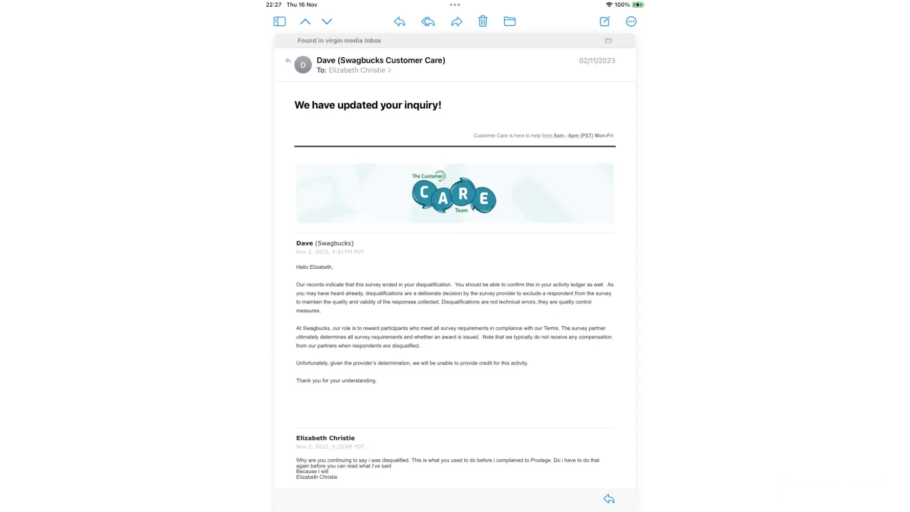 I was deactivated due to "violation of program terms with respect to Special Offer/Offer services." I was just cashing out, and I always follow TOS. Recently, I decided to cash out two $100 Amazon gift cards. After cashing out the first one, I was deactivated. I had no idea why as I love Swagbucks and always make sure to follow their Terms of Service. So, I filed a ticket to see what exactly went wrong. They replied the next day saying that my account needed to be verified with a government ID. I was relieved as I thought once I provide them my ID, they will reactivate my account. Unfortunately, that was not the case. First, I waited over a week for an update, but didn't receive one. Today, I decided to contact them for updates regarding my account. They sent a reply almost immediately saying I was deactivated to due "violation of program terms with respect to the Special Offer/Offer services." I was really upset as I am always careful to follow their Terms of Service. I don't use a VPN, don't have multiple accounts, and I don't do offers twice. So, I figured out that maybe the deactivation was due to a ticket that I had filed on March 18th, and was deactivated on March 20th exactly two days after. The ticket was regarding a TV show I had watched for a survey. The TV show was an Amazon Prime Original known as Carnival Row. I had watched the first season of the show for 5000 SB and participated in a focus group for an extra 5000 SB. This survey was with the Schlesinger Group. I had waited almost a month for my SB to be credited, but it never credited. So, I had filed a ticket not specifically asking them to credit me, but asking them when they think the group would credit me. I also stated that if they think that the group wouldn't credit me, maybe they would consider crediting me. Keep in mind that I provided screenshots of the survey showing as "completed" in my activity ledger, but with no credit. I had also provided a screenshot of the email that I received saying that I was selected for the focus group. Later that day on March 19th, I was credited. I was expected to be credited, but rather given a response as to when the company would credit me. I will also attach the same evidence of the emails I received and the screenshot of the survey being completed in this complaint. So, I was really happy that I was credited, and I decided to cash out the next day. I had 20,000 SB in my account and decided that it was time. After the first gift card, I was deactivated. As a result, that was what happened, and the reason I think I was deactivated. I did nothing wrong as I just filed a ticket on a TV show that I spent nine hours watching and another two and a half hours for the focus group on Zoom. In the first place, I was supposed to also file a ticket for another survey on a TV show called *** that I did for 4000 SB. However, I didn't want to ask too much from customer service. My plan was to send the first ticket for Carnival Row and send the second ticket for *** after waiting for a bit.