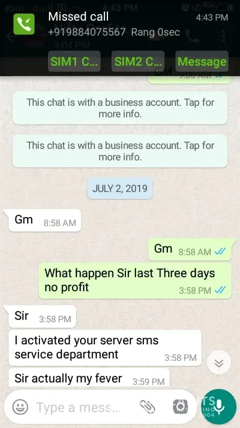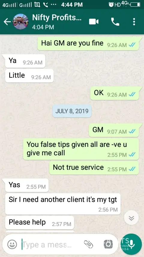 They will send you a tip "for ex buy sbin 1800 call at 120", if the call goes up they will send you follow up message to exit out etc. But if it doesn't go up they will not sending you anything, and when you call them they will not pick up the call or it will always come as engaged. At this point they know that their call went bad so manish disappears. Immediately after this at around 2:30 they will send you another tip (This time second tip on the same day) to buy nifty or short nifty, this time when they send a tip they will also give you a target like this "buy nifty 4800 at cmp target 200", but when you place an order it's already at 202.in about 30 seconds you will get another message stating, book full profit at target 202. This all happens in last few minutes in the market so you will never catch this. Read next what happens. On their performance chart they will only add nifty call they gave (Which was already there) and they will completely ignore sbin call they gave. So their performance charts you see always looks promising. Couple of times i called for the bad call and manish told me that it's upto you whether you want to keep sbin or no, or something like all calls are intraday if you did not got sms than it's not our fault.