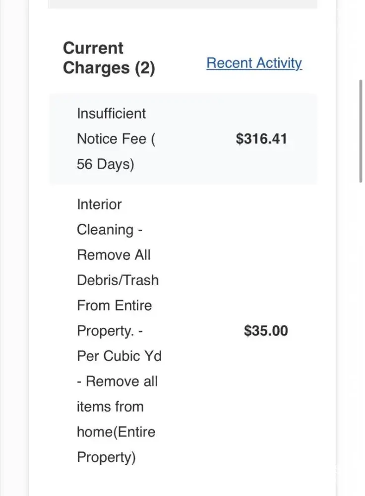 My son, his girlfriend and I rented a house from Progress Residential *** December 17,2021 paid the required fess a long with December prorated rent for the 15 days of $715.49 security deposit of $1720.00 plus smart home fee of $17.00 etc. We paid our monthly rent of $1720.00 smart home fee $17.00, and any utilities (Such as Gas, Water, Sewer, Storm and service fees) charged for the months on time every month. On October 1,2022 we gave our written notice to vacate the premises via email per agreement which was a 2.5 months' notice which we only needed to give a 60-day notice. On October 20,2022 we were charged for the remaining utilities Gas $173.86, Water $142.62, Sewer $185.71, Storm $29.63 and service fees $15.90 from statement June to December 19,2022 totaling $564.72 which was paid in full along with Novembers rent $1720.00. We also have paid for professional cleaning of the house $475.00 after moving out per our lease agreement which the house was not clean for our move in. We are now being charged our prorated rent for December for 19 days of $1054.19 which is correct to our belief and that has been paid on November 29,2022 along with the $17.00 smart home fee that was not prorated. Now we are being charged for the remaining 12 days of December $708.39 a month-to-month fee of $141.68 and now have been charged a $125.00 late fee for those charges that are not our responsibility, which these remaining balances was not ever discussed with us prior to this and is not in our lease agreement that we would be charged for, We have called and not received any call backs to resolve this matter. We DO NOT want this to reflect on our credit or rental history for we have not created this mess. We just want it resolved and not be charged for days we are not living in the residence and not damage our history. You can look on their web site and the house is listed for available December 30,2022.Thank You