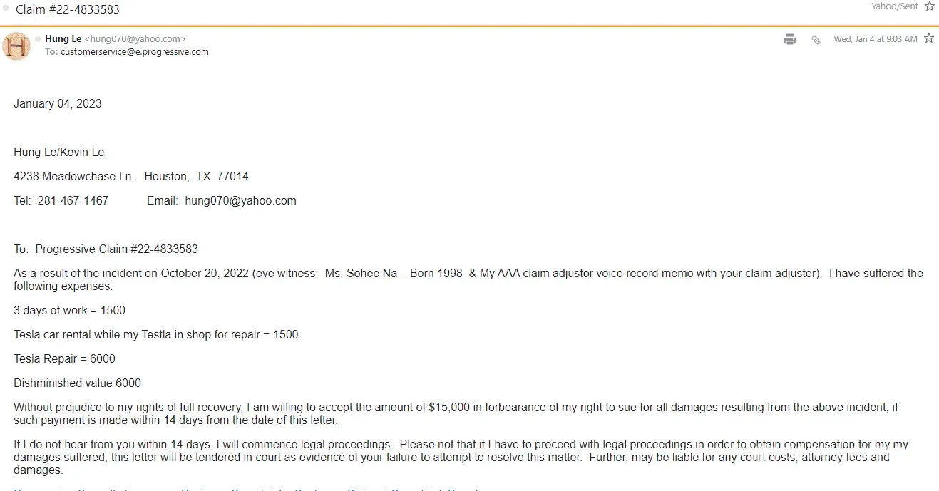 To: Progressive Claim #[protected]