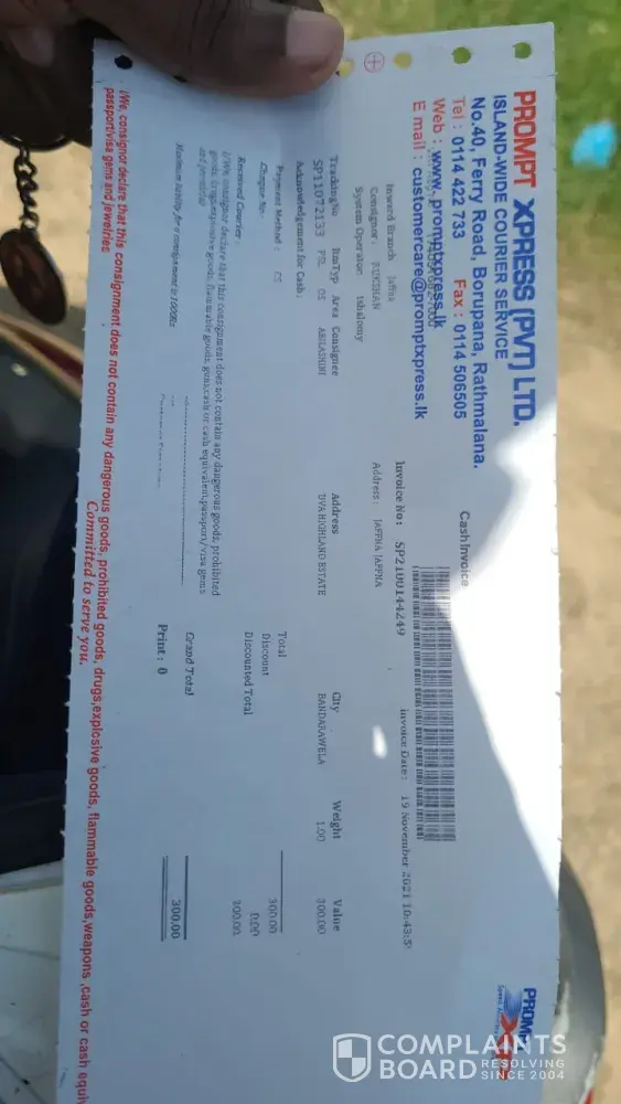 Complaint to Prompt express Kandy branch