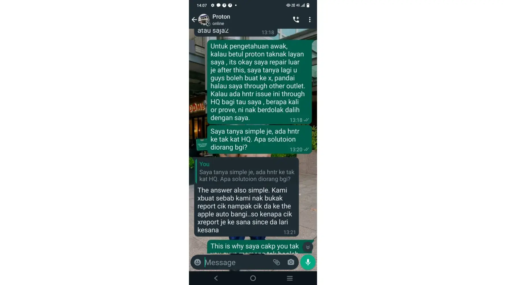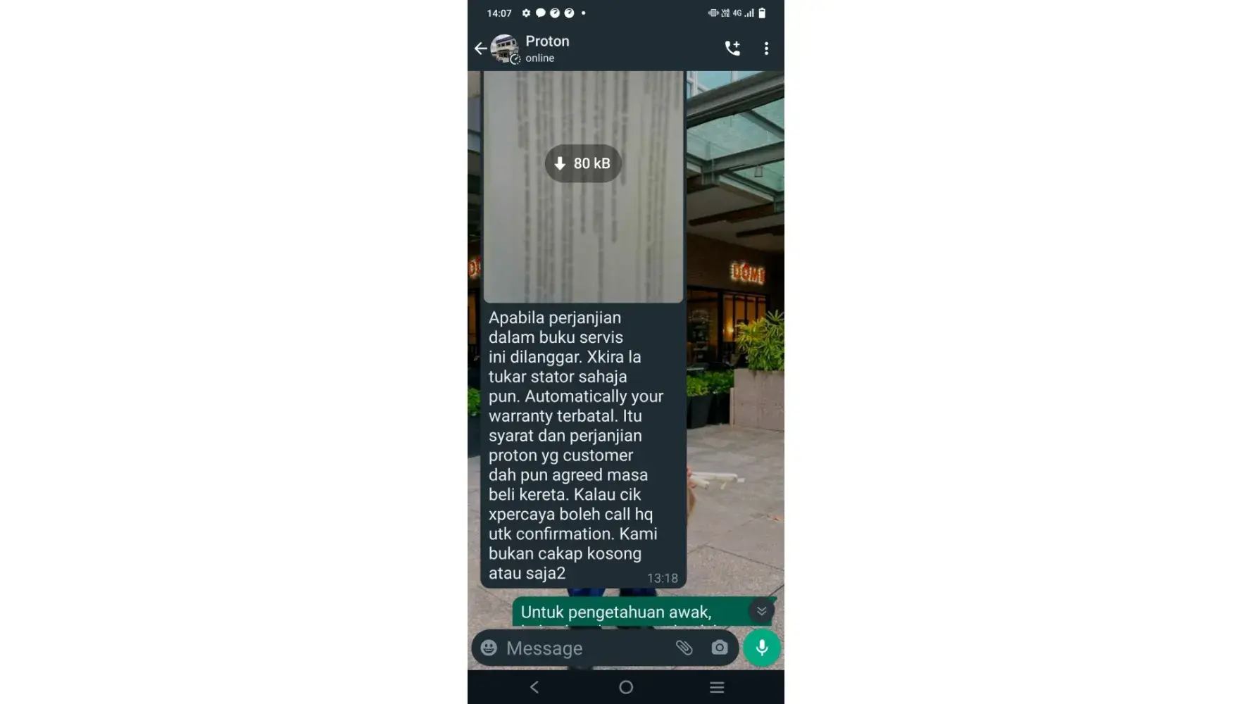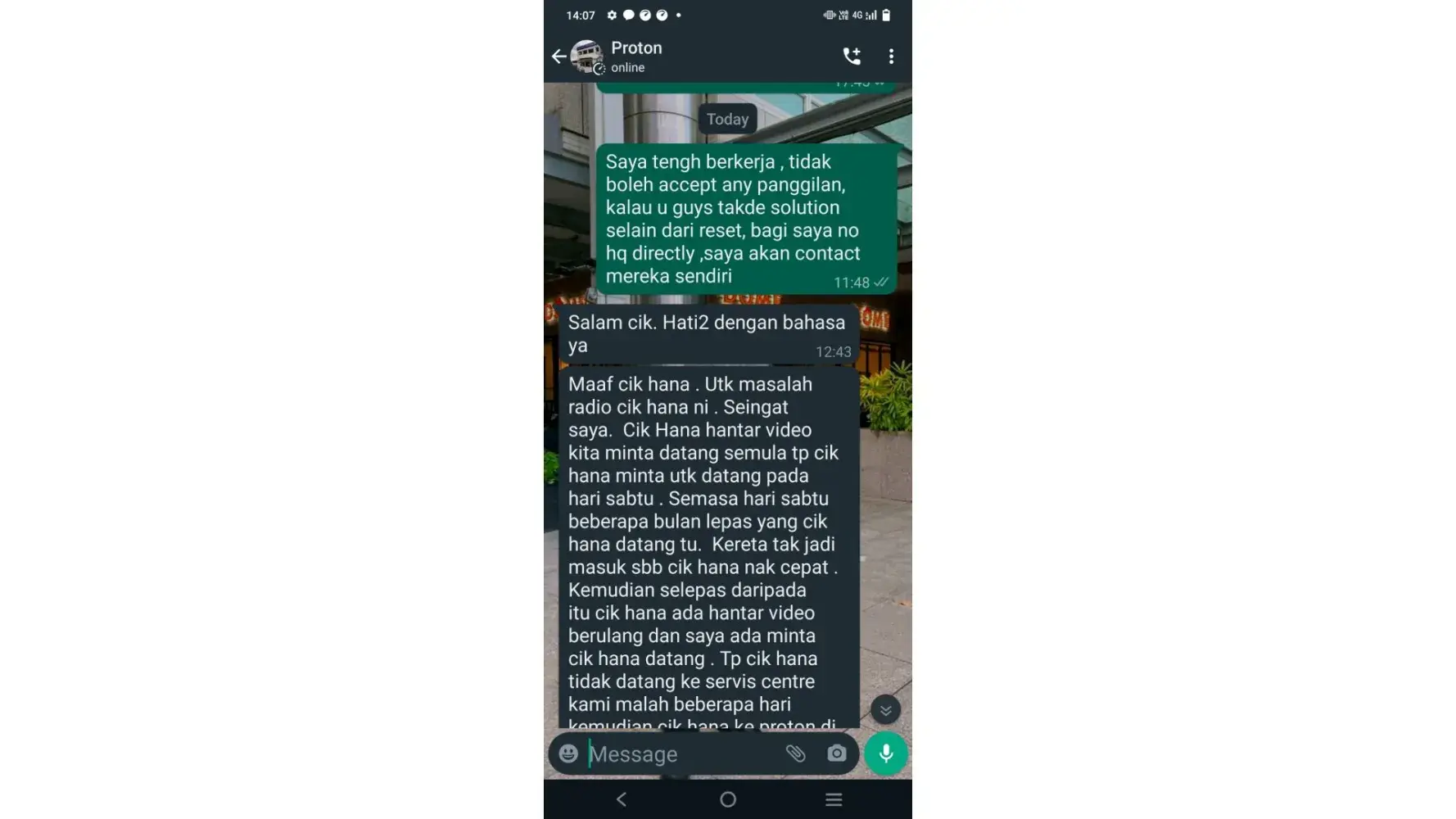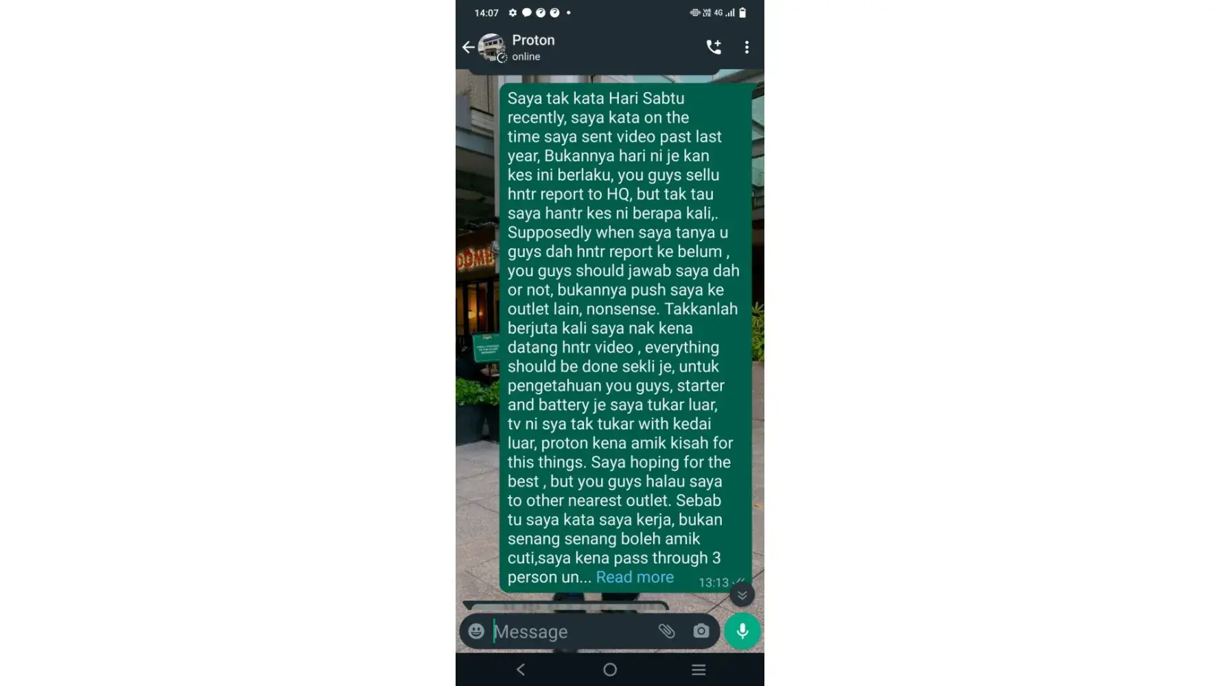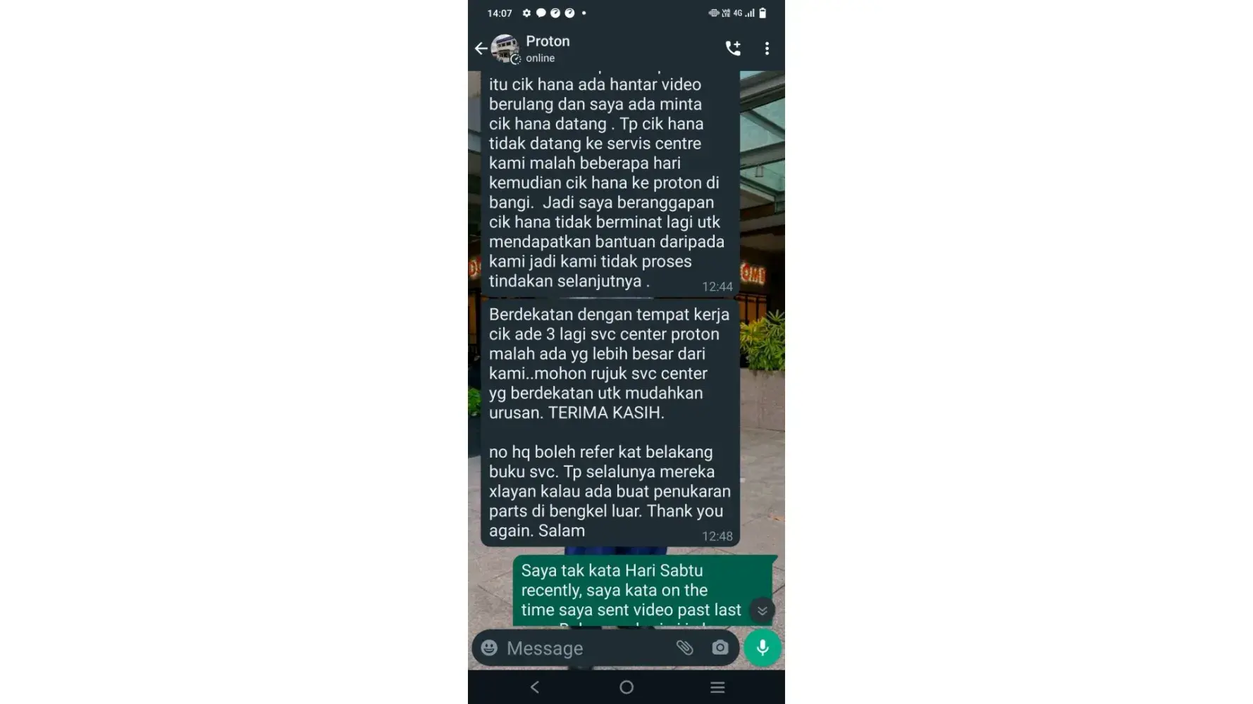 Mereka juga berkata sekiranya kereta saya telah dieprbaiki oleh pihak luar, Pihak HQ juga tidak akan layan, saya hanya menukar starter saya di luar kedai kerana kereta saya mati ditengah jalan selepas waktu berkerja proton sudah habis.