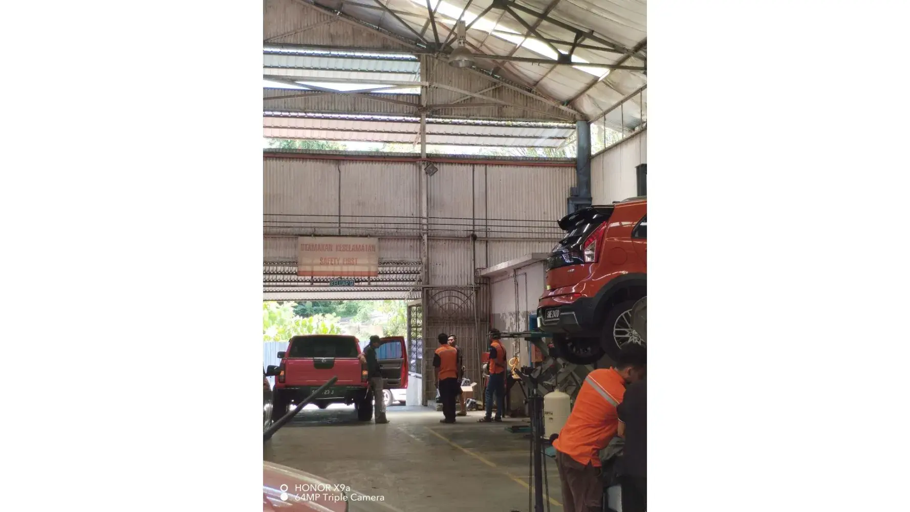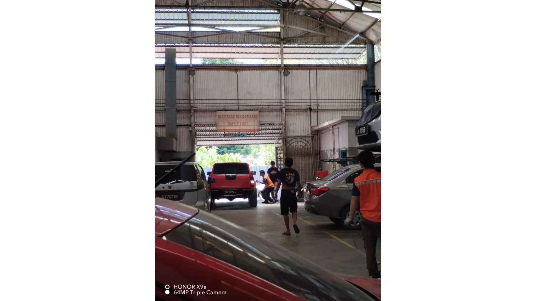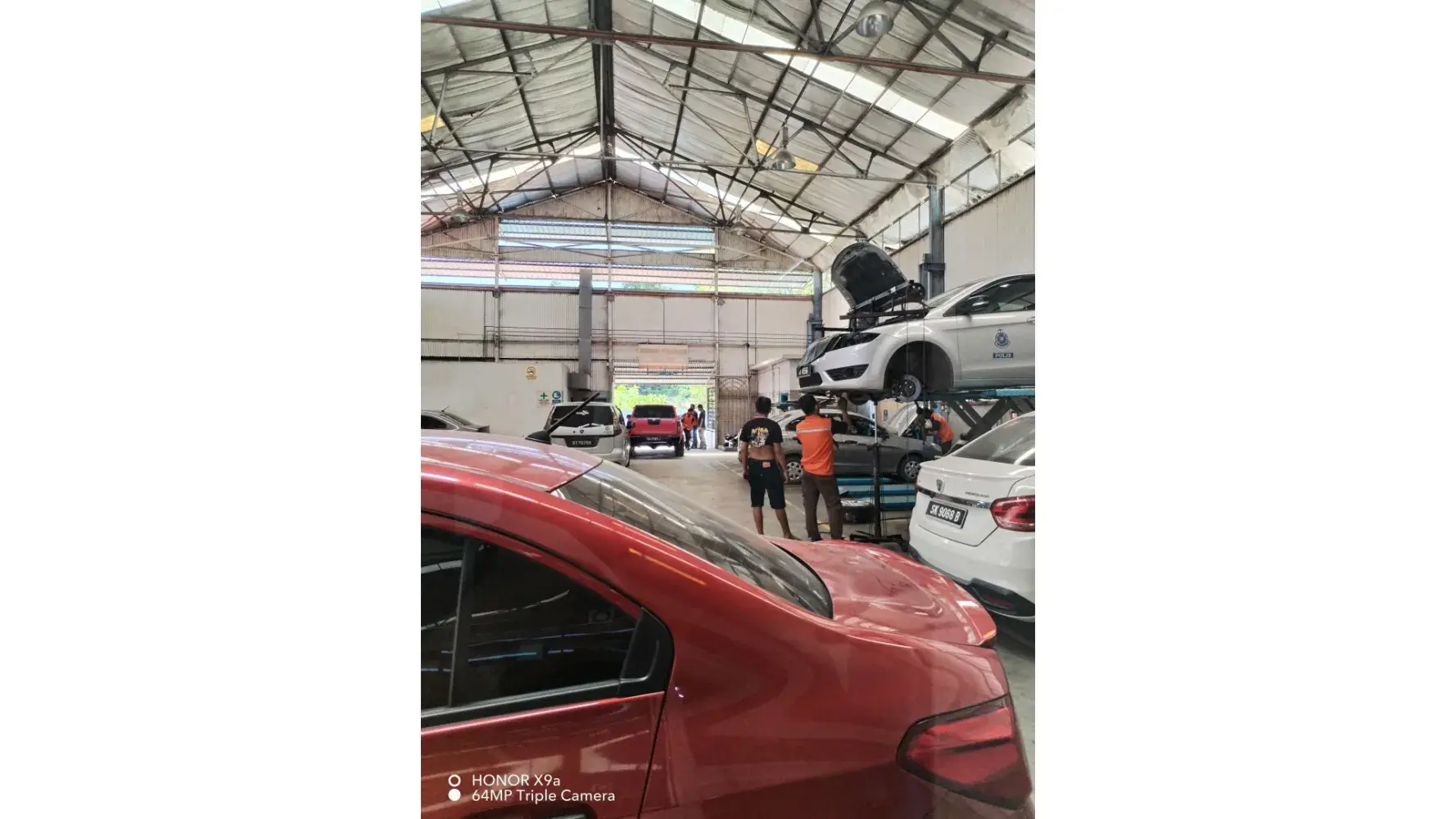 Pekerja atau foreman sibuk menguruskan kereta orang lain/kawan mereka yang tiba-tiba masuk ke bay servis.