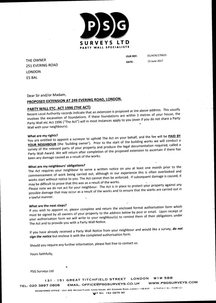 Disgusting, crafty, company! Sends letters to your neighbours after looking at planning applications telling them to instruct PSG and you will pay, total vultures! Our neighbours have stated that they felt under pressure to sign, and that it was implied that they needed to go with PSG and not our Party Wall surveyor.